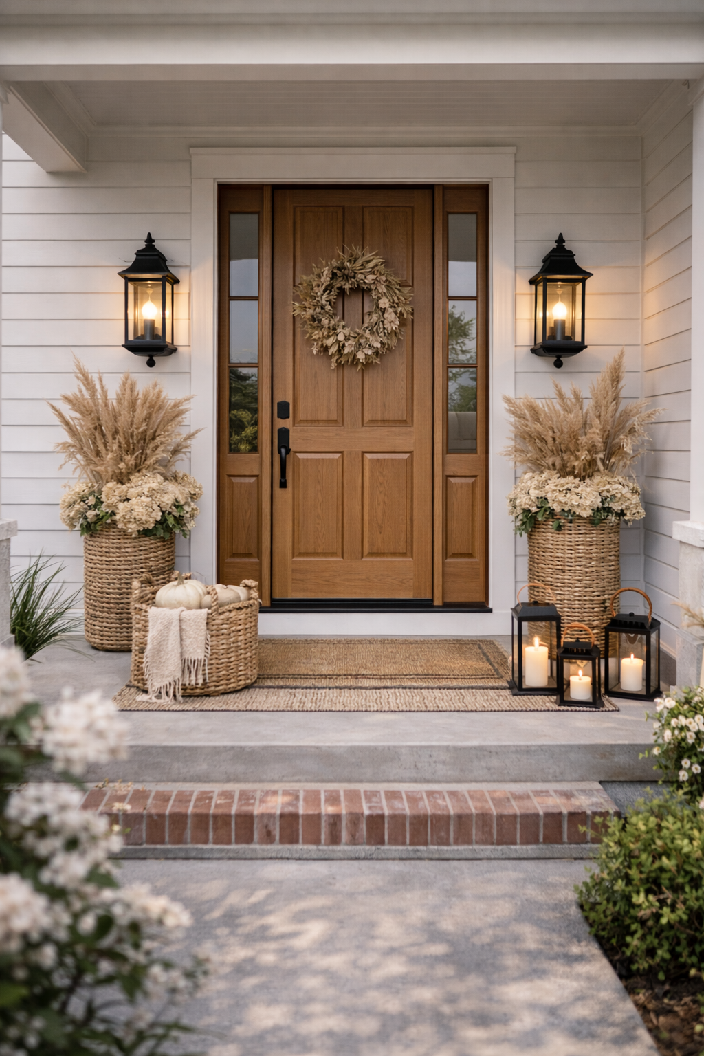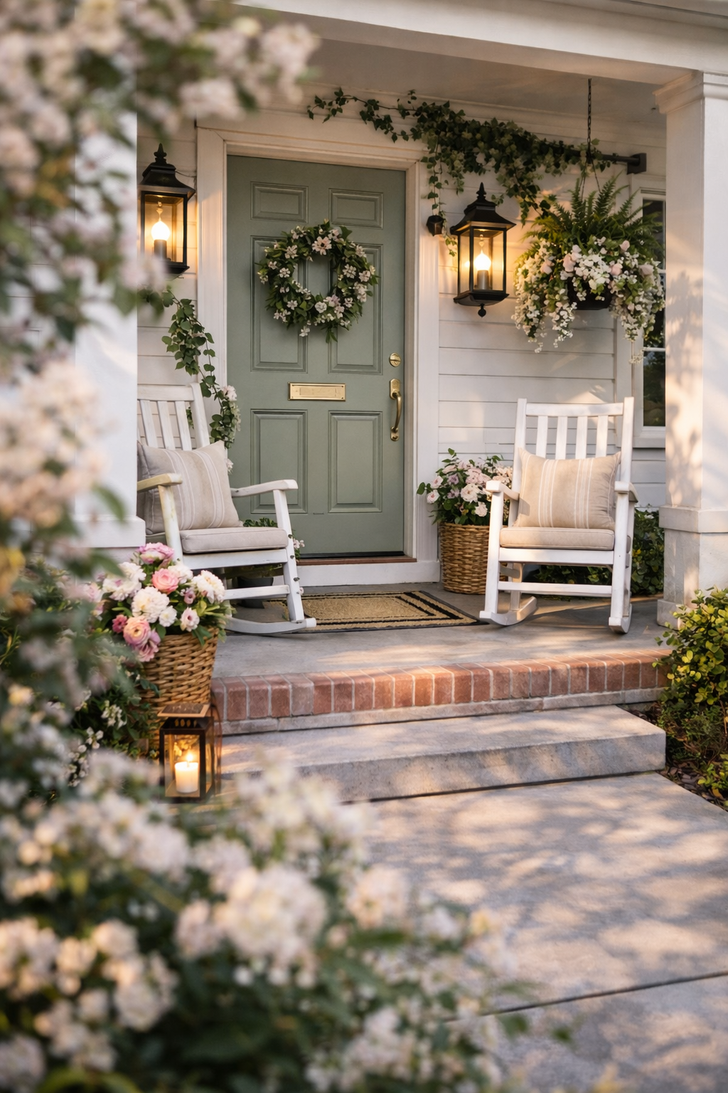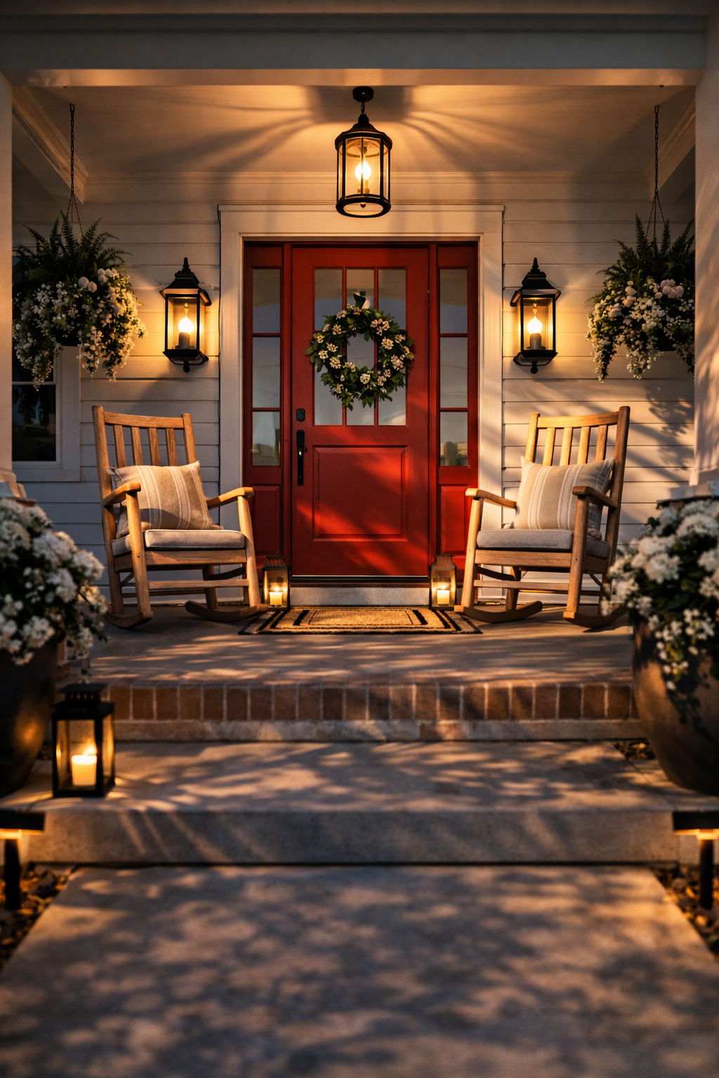 Lighting enhances the curb appeal entirely after the sunsets. There are strings of lights, lamps, and dim wall sconces that bring magic. The home appears welcoming and secure because of the warm glow that spills out onto the steps. The evening porch styling is particularly effective when it comes to parties or a colder season when the outdoor atmosphere plays the biggest role.