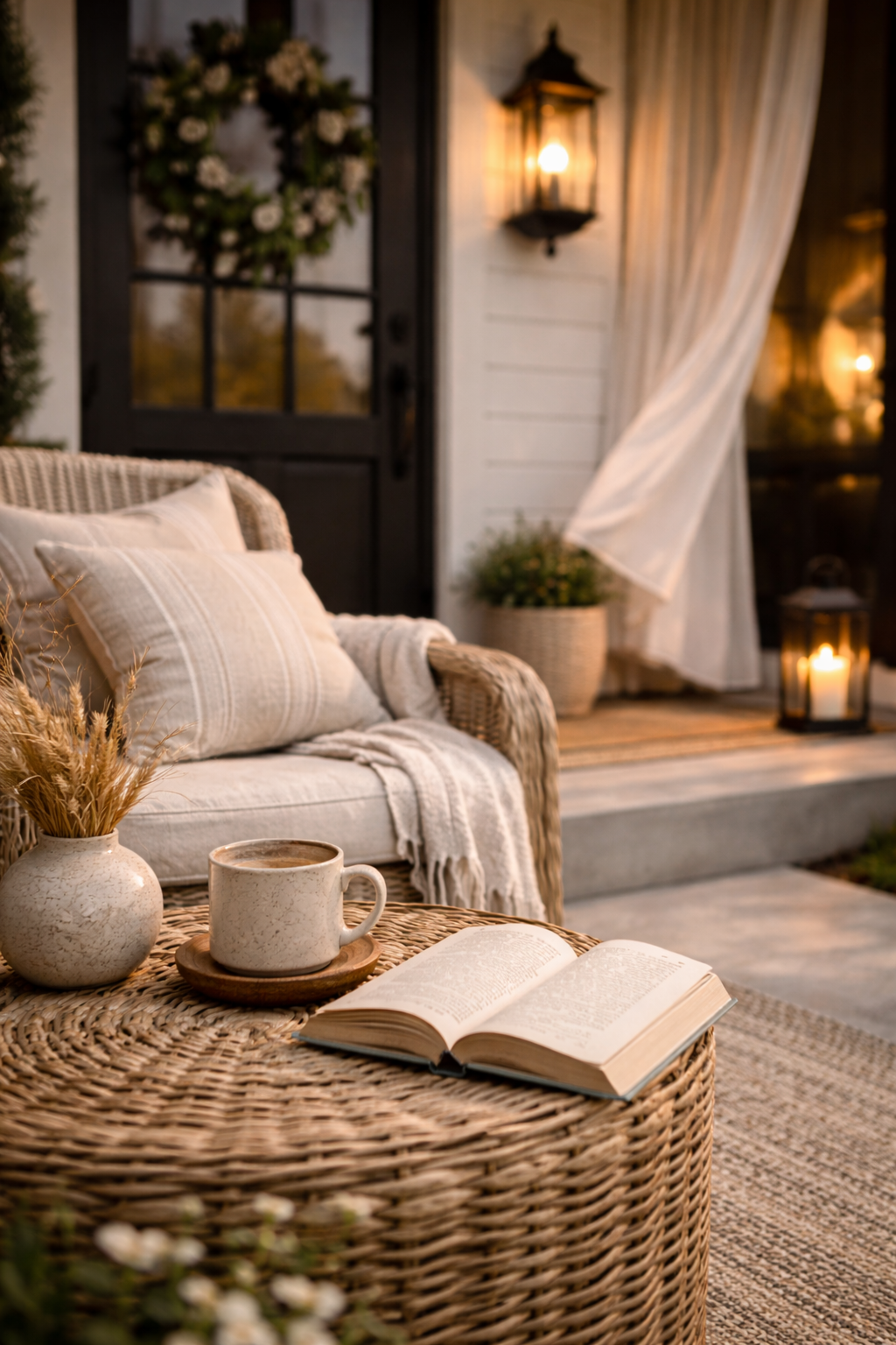 Curb appeal is sometimes found in details. Splendid elements of a warm vignette can be achieved with a comfortable bench upholstered with textured cushions, a ceramic plant, and a woven lantern. Close-up styling is cheerful and cozy in your porch; it is a combination of various materials – wood, metal and fabric which give it depth and character.