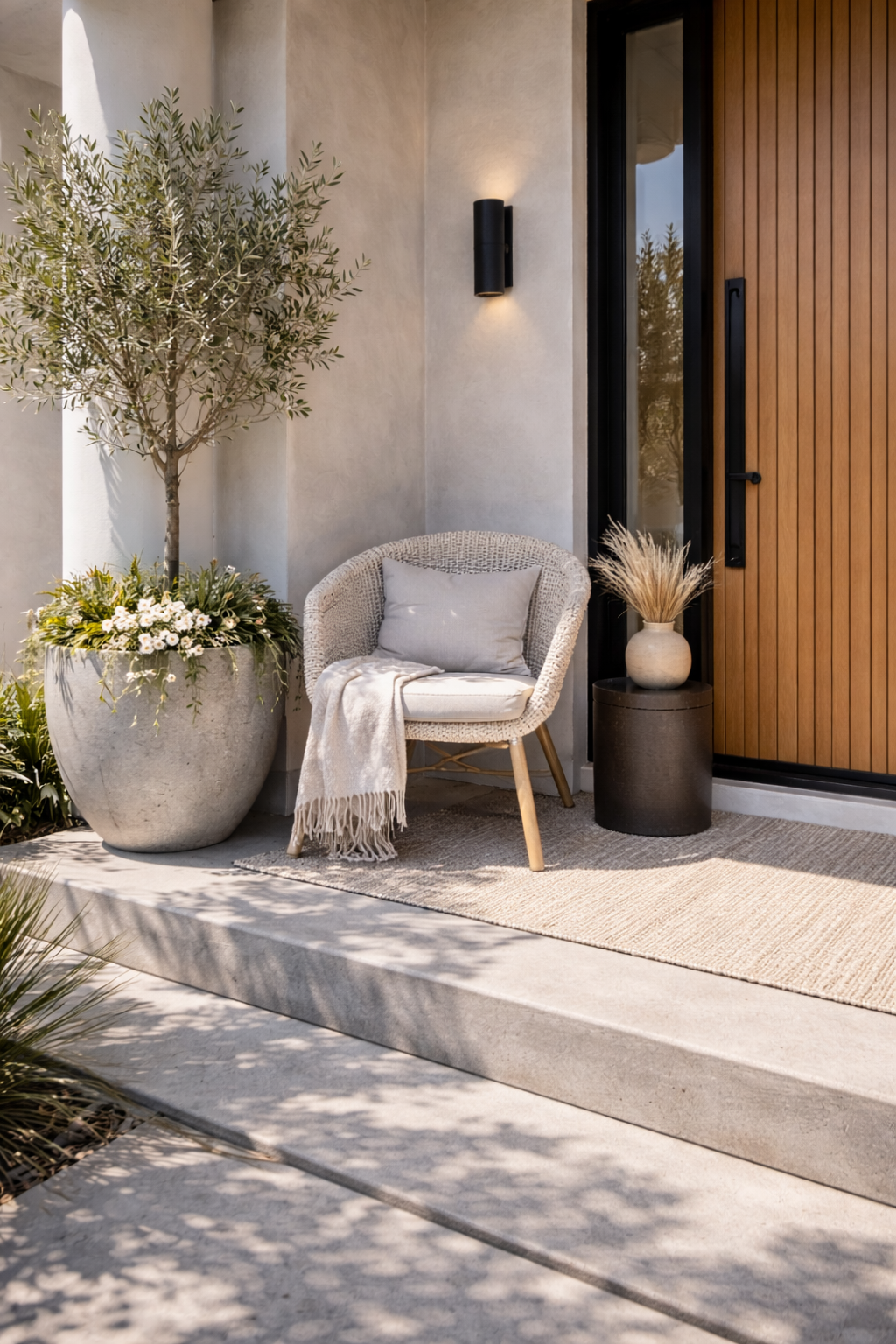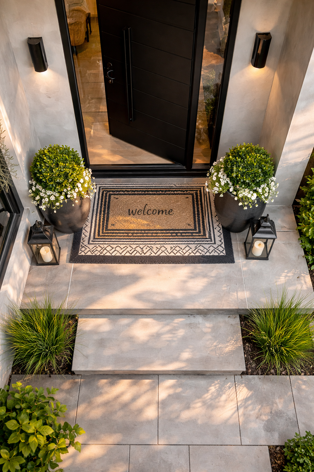 The front porch is designed in a top-down style and has a balanced and refined appearance. The space is deliberate and well-organized with layered welcome mats, symmetrical planters and clean-lined doors. The design is very effective in a contemporary house where simplicity and symmetry improve the architectural characteristics. The color scheme is kept to a minimum with greenery to ensure a high-end curb appeal.
