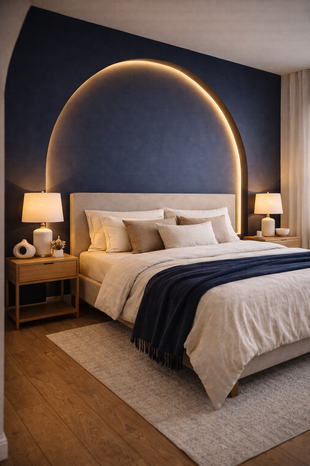 For a distinctive look take into consideration designing an architectural element like an arched navy accent wall that is behind the bed. The soft LED lighting around the arch emphasizes it and gives a warm atmosphere. The neutral bedding, modern furniture, side tables and other sculptural decoration pieces make up this chic and modern bedroom.