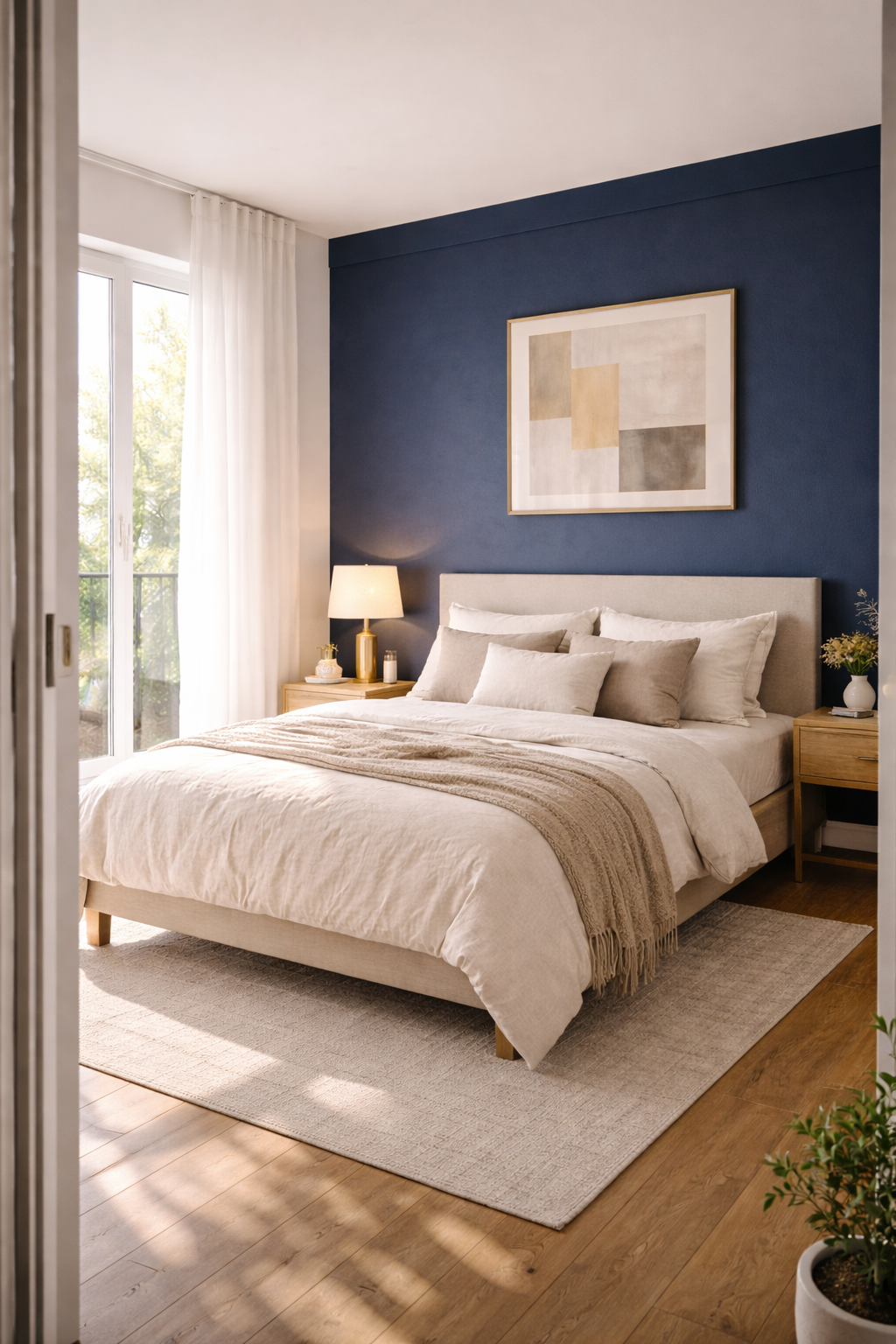 A wall with a navy accent can be a great addition to bedrooms with access to the balcony. In this particular style the wall is placed next to huge glass doors that are open to let in natural sunlight. A contemporary bed with creamy bedding, abstract artwork and the bedside lamp is gold. an elegant, yet cozy setting. The light that is streaming through the balcony curtains softens the dark blue walls and brings warmth to the area.