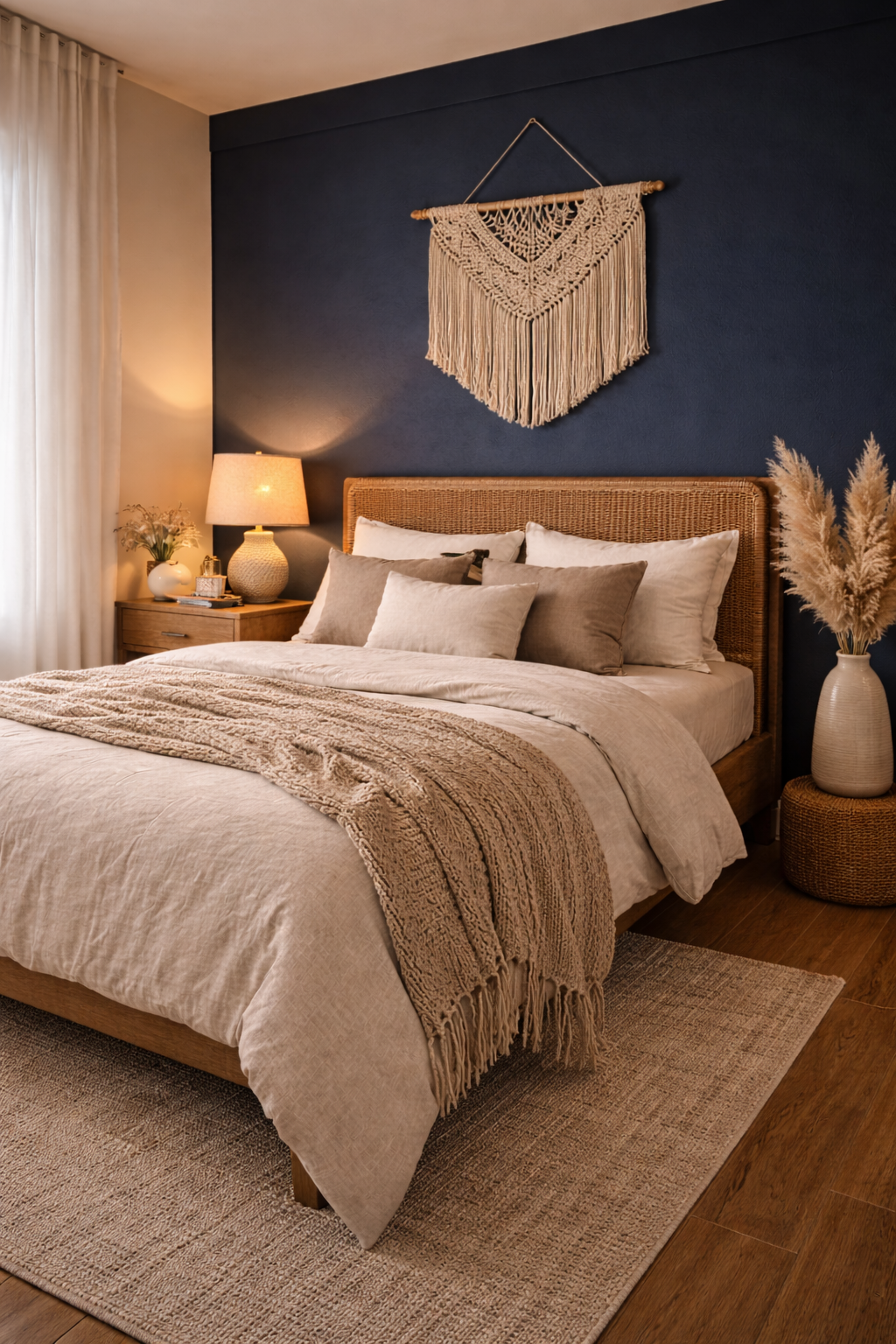 The navy wall looks great in a boho style bedroom. In this design the headboard bed of rattan is set against the dark blue wall providing an inviting and warm contrast. Macrame wall decor as well as pampas grass provide texture along with rug rugs with patterns and blankets make the room cosy. This creates a comfortable bedroom filled with character and charm.