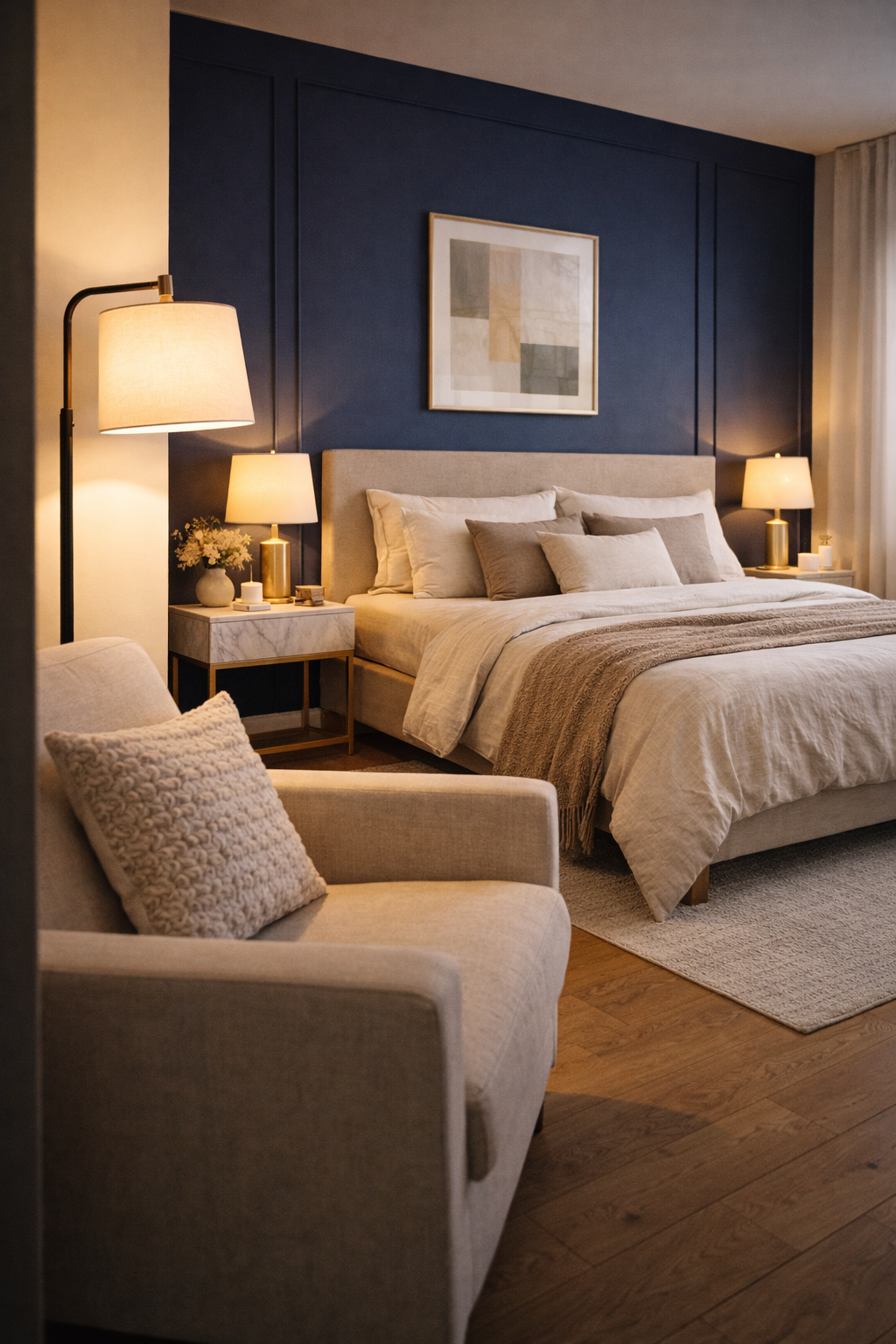 A navy accent wall could be a great way to create a relaxing reading space in your bedroom. In this arrangement the bed will be set against the wall of navy and a comfy armchair and floor lamp provide small reading spaces at the end of the room. The neutral bedding, the cushions with texture, as well as a rug that is soft makes the space feel cozy and welcoming.
