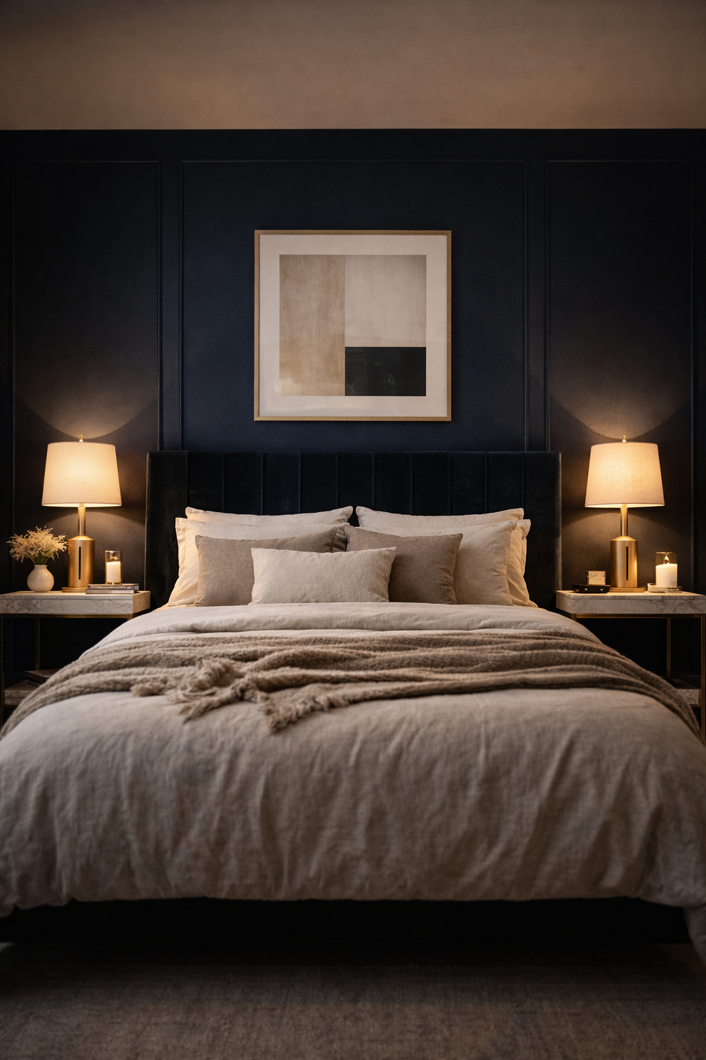 To create a chic hotel-inspired style with a dark navy-colored accent wall is an excellent option. This design is perfect with a bed that is velvet and sophisticated neutral bedding. Gold bedside lamps give warm light, creating an inviting glowing contrast against the dark wall colour. The marble nightstands and the framed artwork give a luxurious finish to the space.