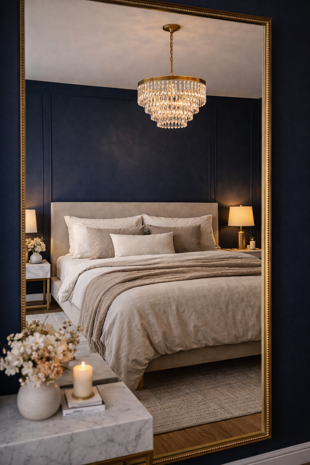 Mirrors can increase the class of the bedroom with a navy accent wall. Installing a large decorative mirror next to the bed will reflect the color of the wall as well as the décor around it creating a room that feels more spacious and more bright. Combine this design with a headboard that is upholstered and a marble bedside table and fresh flowers to create a sophisticated and elegant bedroom decor.