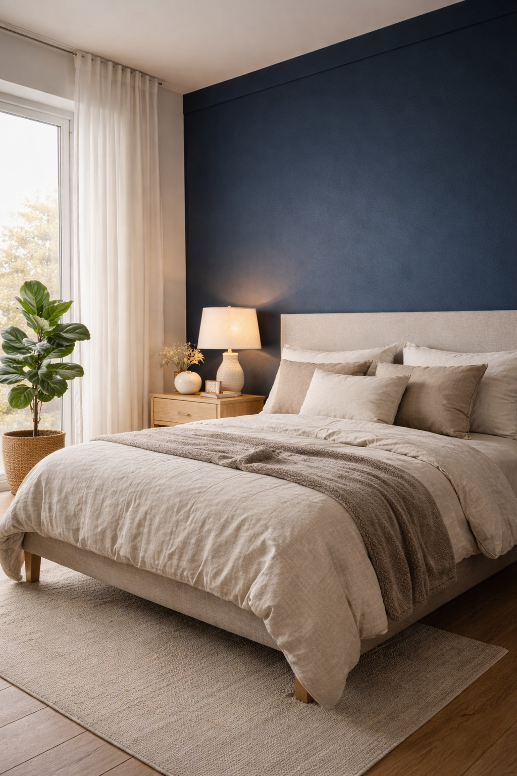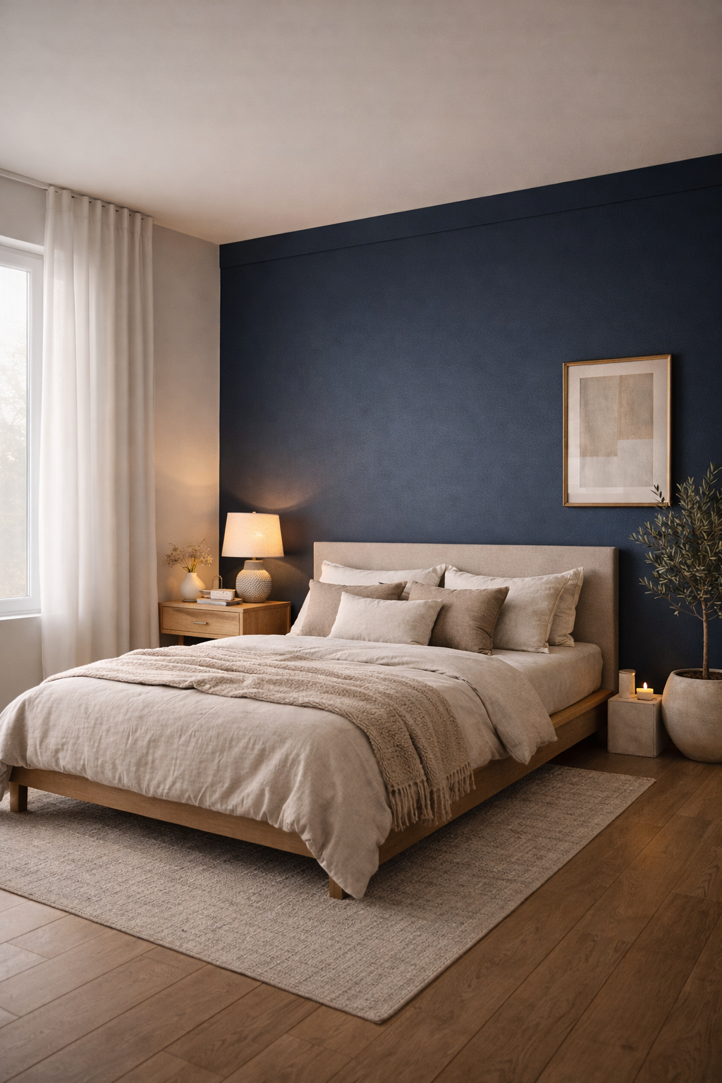 A blue accent wall can be stunning when combined with natural light from windows that are large. In this style the rich navy wall is positioned behind the minimalist bed and soft bedding. A simple wooden nightstand and ceramic lamps add warmth while the sheer curtains let sunlight illuminate the space. The contrast between the vibrant wall color and soft neutral décor creates a calm and peaceful bedroom ambience.