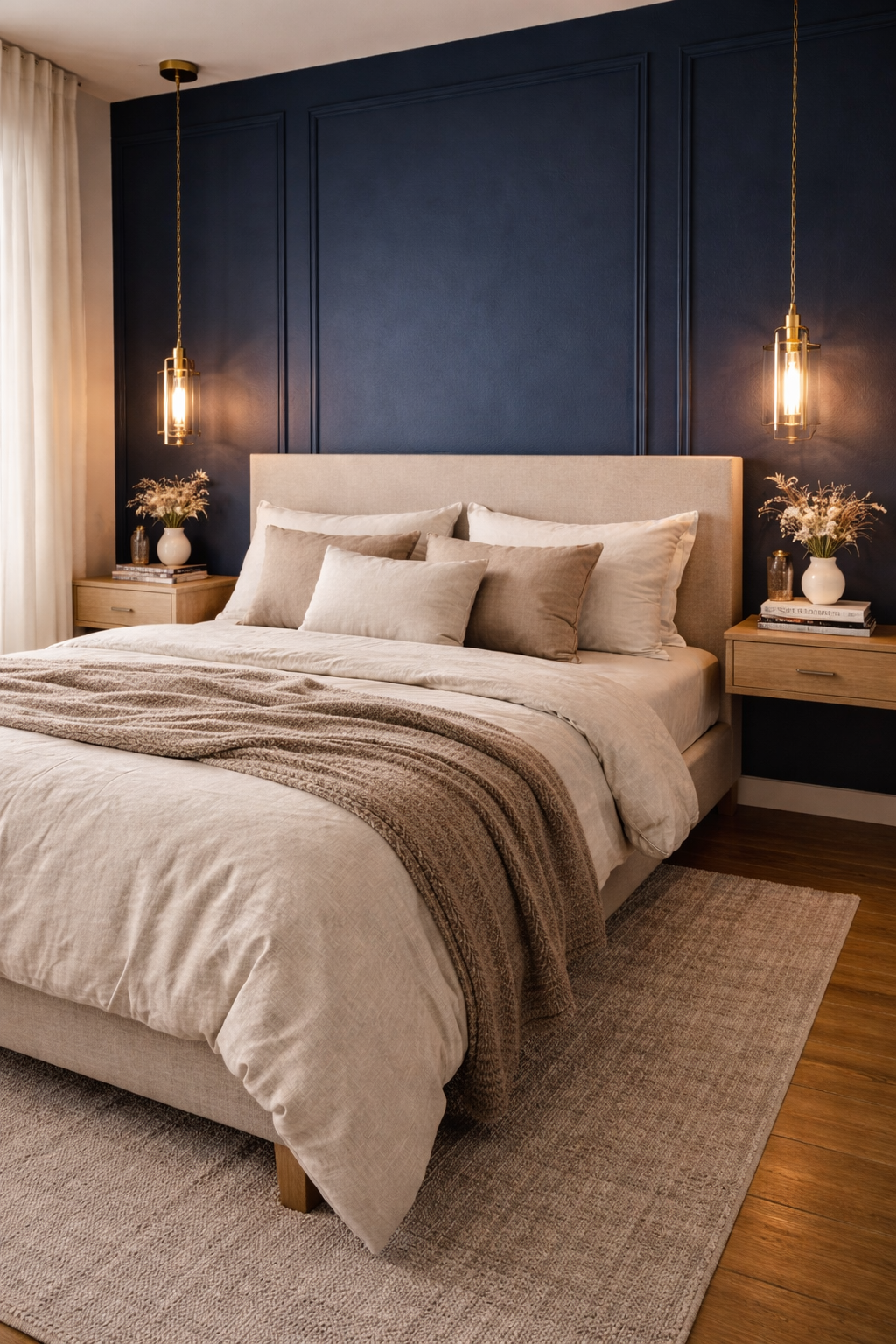 If you want a more lavish look you can consider adding a soft wall moldings for your accent walls in navy. This style adds the illusion of depth and architectural details while still maintaining the elegance. Combine the wall with a bed that is large, featuring the softest of beddings, a layer of neutral beddings, throw blankets as well as decorative pillows. Brass pendant lighting above floating nightstands provide an elegant touch that makes the space appear elegant and cozy.