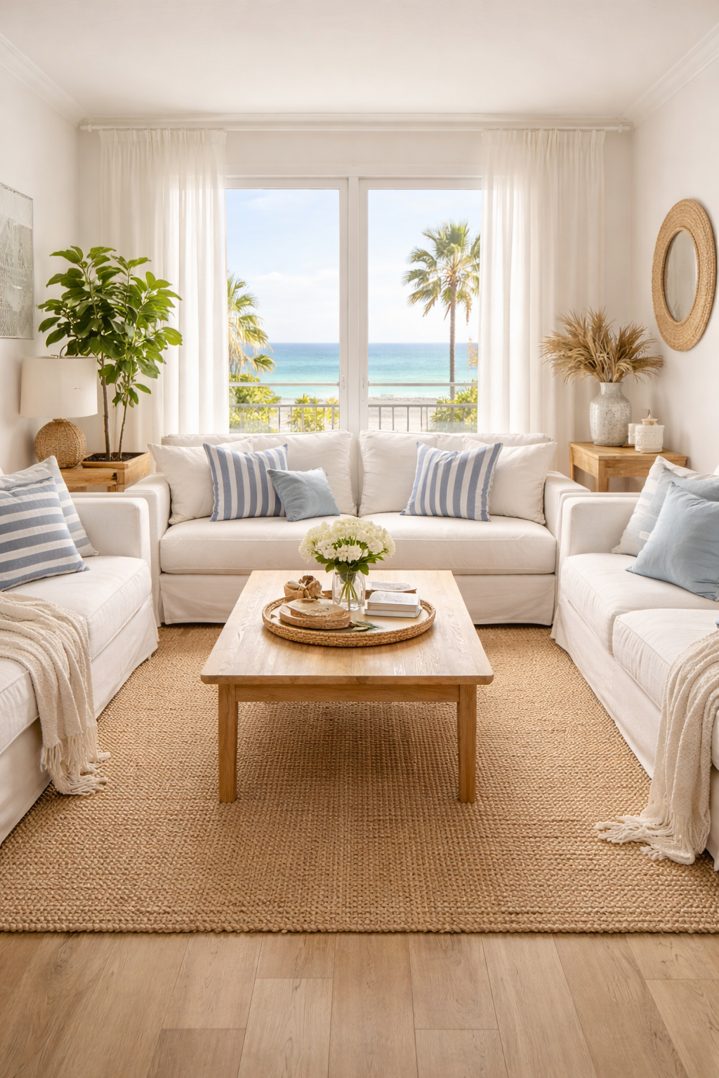 A coastal living space provides a tranquil, beach-inspired ambience even if you are far from the sea. Choose a white or light-colored sofa and pillows with stripes of blue and the Jute rug. Natural materials like driftwood and wicker baskets give warmth and texture. The color palette should be delicate and airy, with shades of sand, white, as well as light blue. The style is calm fresh, refreshing, and timeless. It is perfect for homeowners looking to create an unpretentious and relaxed living space.