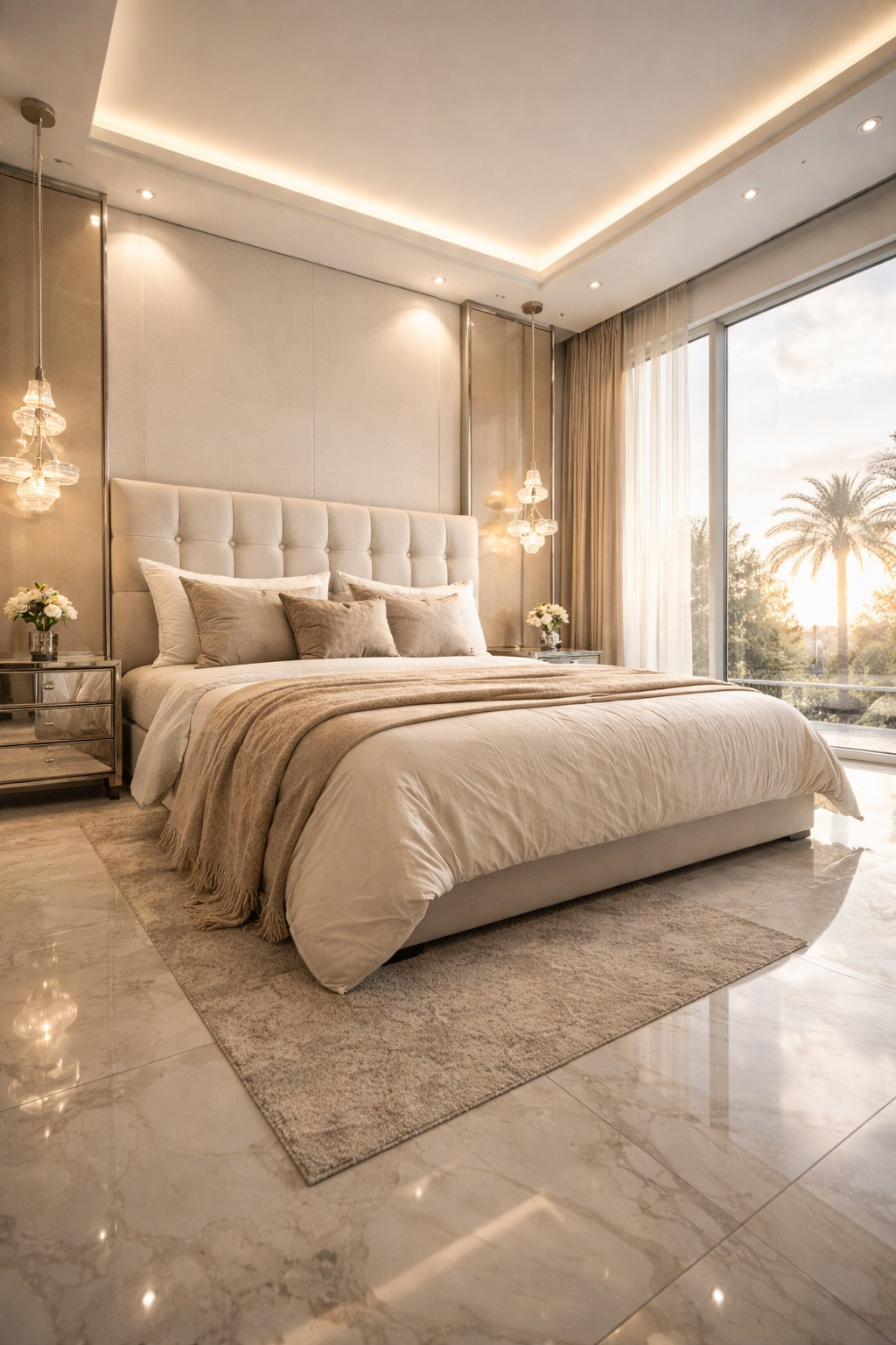 This is as clean and open as it gets and it is pure sophistication. Imagine large upholstered headboards, neutral bedding, floor-to-ceiling windows, which surround the room and fill it with natural light. Stick to the palette of ivory, taupe, and beige but it would feel calm but very expensive. Include sculptural pendant lighting and recessed ceiling lights in the background to make the atmosphere higher. Here the point is simplicity with luxurious finishes.
