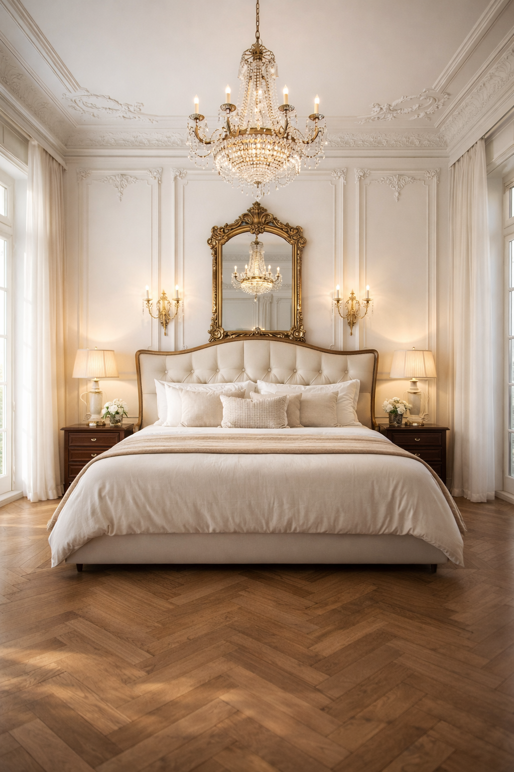 To achieve the classic royal style, adopt the influence of the French. The fancy wall mouldings, old gold mirrors and crystal chandeliers immediately introduce the aura of the palace. Combine ivory tufted headboard with tall sheer curtains and hard wood flooring. Everything is symmetrical in this style – nightstands and lamps are repeated to achieve the elegant appearance.