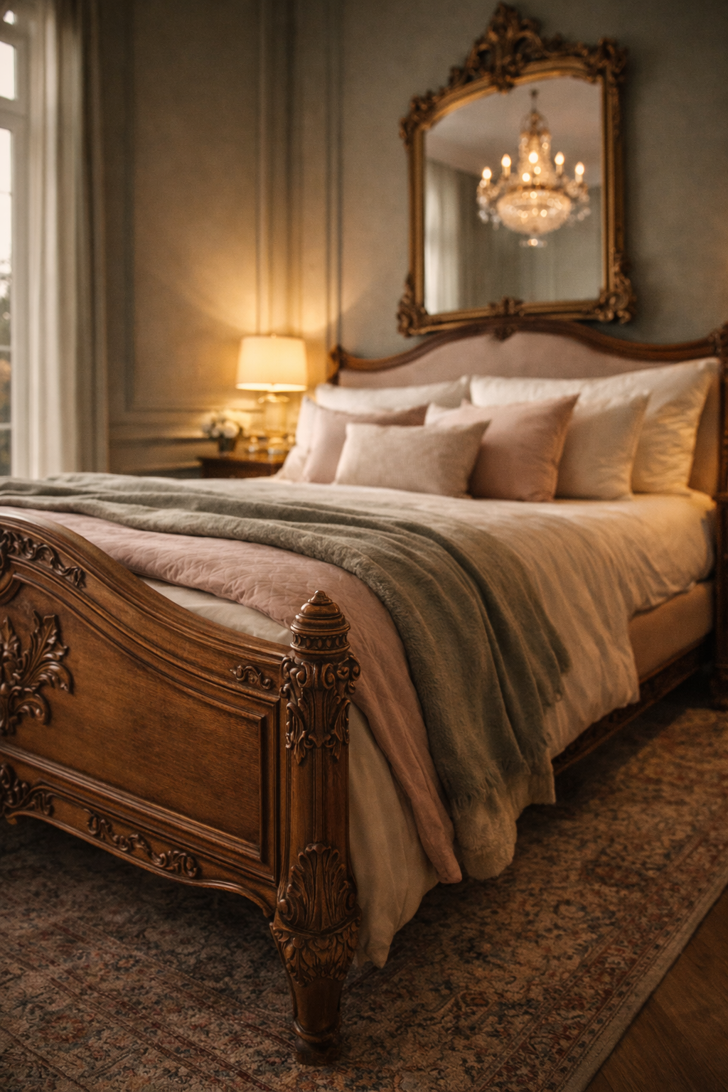Carved wooden furniture is the epitome of royalty. A traditional bed frame with fancy decoration immediately brings a touch of elegance. Combine it with cool or dull green walls to create an elegant background. The heirloom-inspired design is finalized with antique mirrors, vintage carpets and bedding overlayed in pastel. This is a style that is classical and majestic.