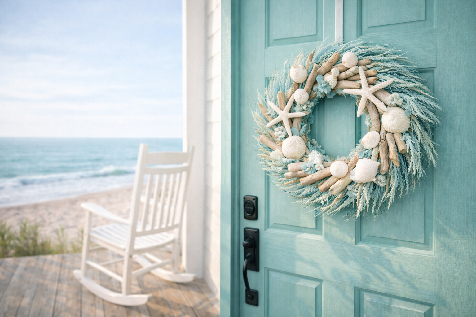 In that case you are a fan of beachy-style, you can have a coastal wreath created using driftwood, sea grass, and white starfish. It is on a blue door, which is a pastel shade, and immediately creates the impression of a relaxed day at the sea. This appearance is a good match with light and airy porches.