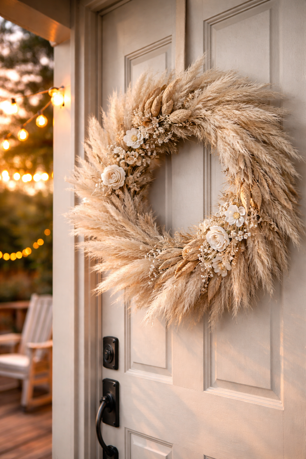 To get a softer, more natural look, try a wreath with pampas grass, dried flowers, and wood beads. The mix of textures gives it a warm feel. If you take a photo during sunset or sunrise with soft light, it will look really cozy and inviting at your front door.