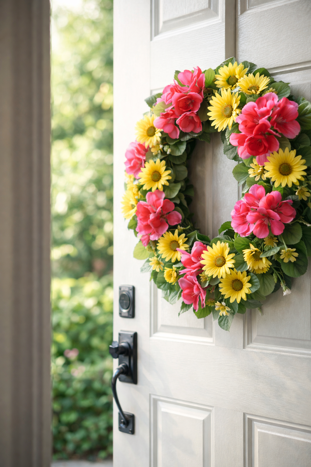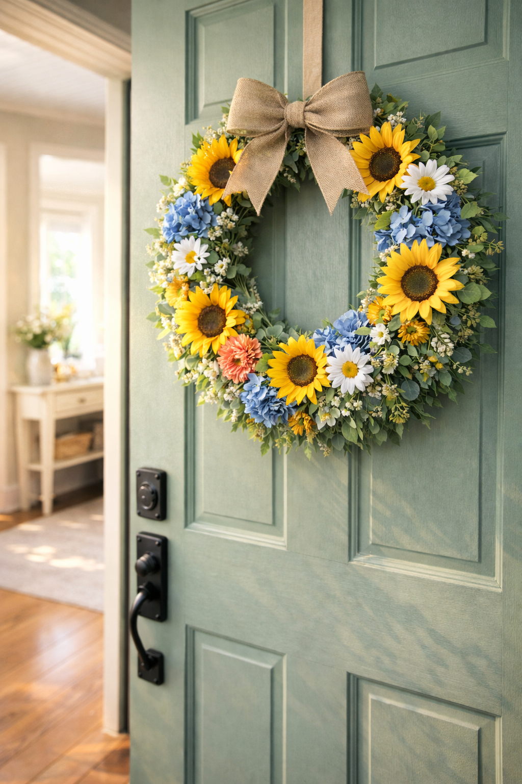 To make your wreath look even cooler, try hanging it on a door that’s slightly ajar. Let the sunlight stream in—it’ll give your entrance a fresh, open feel. This way, your summer wreath just feels like a natural, inviting part of your home.