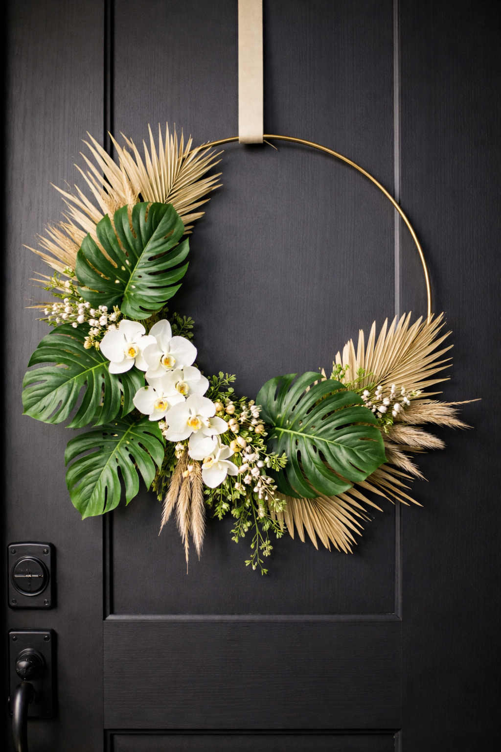 In the event that you are more likely to clean lines and modern decor, a minimalist metal hoop wreath is a breathtaking option. It includes monstera leaves, dry palm leaves, or neutral flowers, which make it easy to feel fresh and elegant. It suits black, white or matte-finish doors.