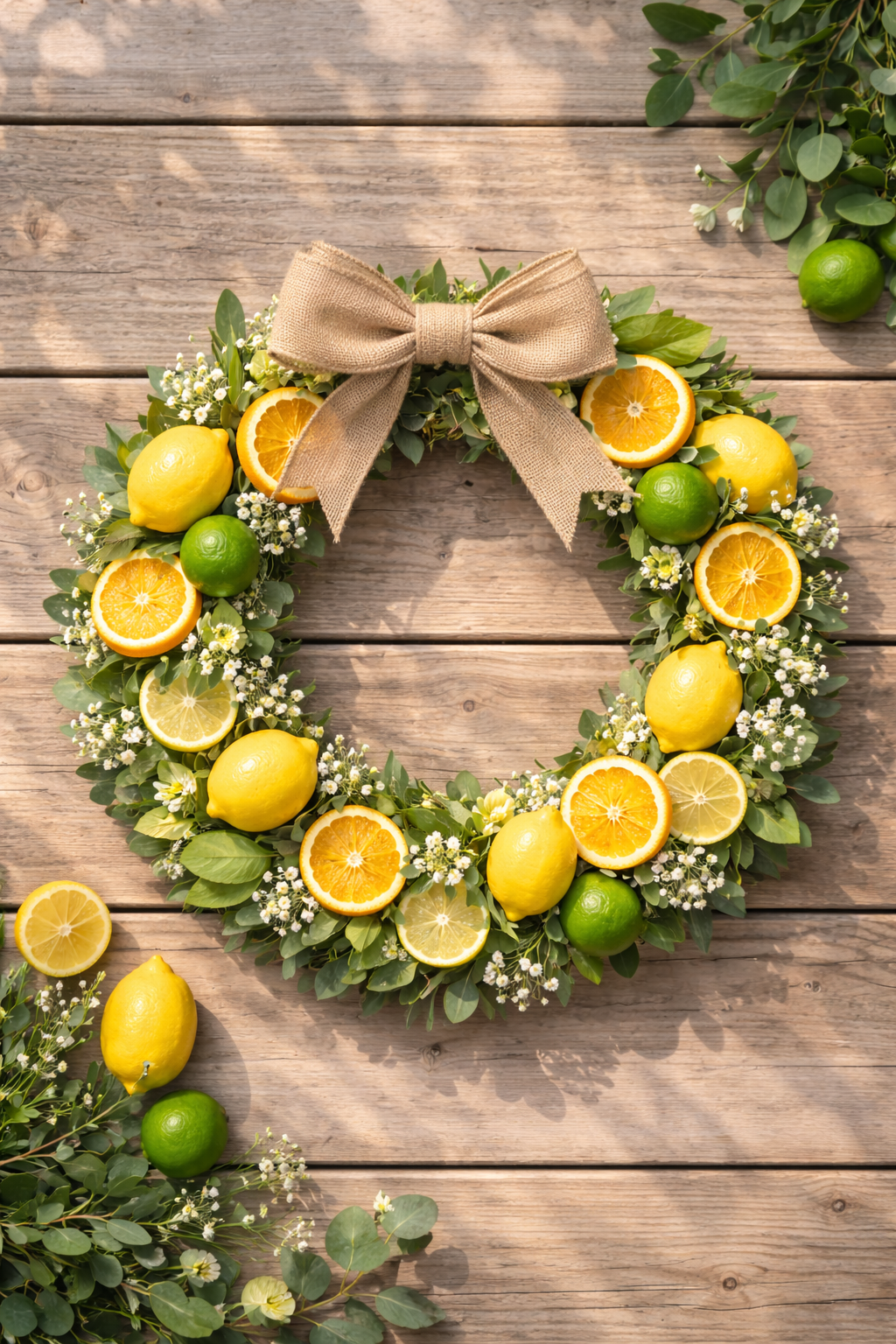 Lemons and limes are the words summer. A citrus wreath with vivid yellow lemons, green limes and rough greenery material is an instant energy boost to your entrance. Combine it with the warm wood on a simple look that has got a Mediterranean touch that feels like the sunshine.