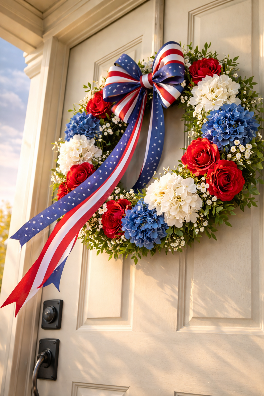 Patriotic celebrations also come in summer. This wreath, decorated with red flowers, blue details, and stars and a set of ribbons, will give a festive appearance to Memorial Day or the Fourth of July. The style suits the traditional cream or navy doors well.