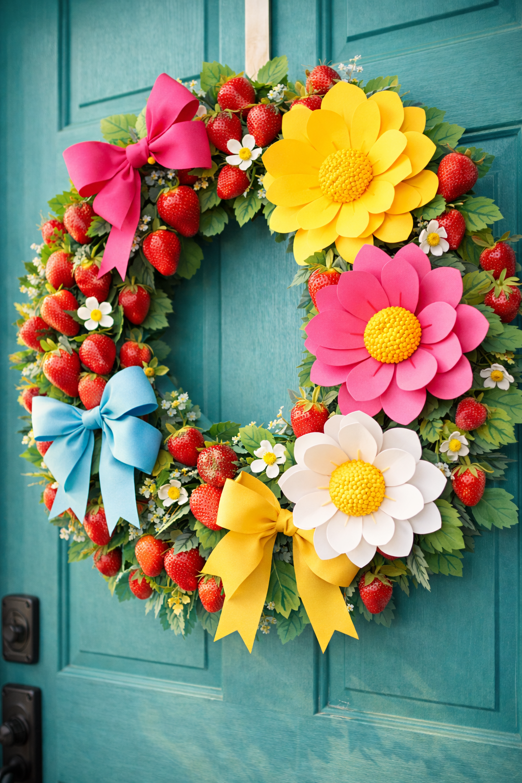 Add a personality of a fruit-themed wreath, made of strawberries, large colorful flowers, and bows. It is a sunny and cheery design that would suit outspoken colored doors such as teal or navy. It gives a lighthearted joyful touch to your summer decoration.