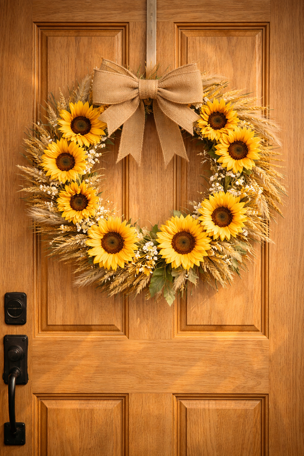 Sunflowers are warm and positive to the environment. A natural wood or neutral door is enhanced by a sunflower wreath that appears to give the look of a happy farmhouse. Attach burlap accents or pieces of eucalyptus to tone down the intense yellow and to make the design even.