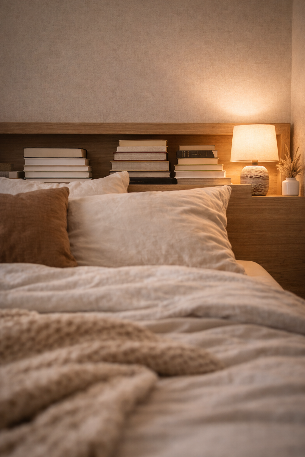 Layer lighting such as tables lamps, LED strips or sconces as opposed to relying solely on the harsh overhead lighting.