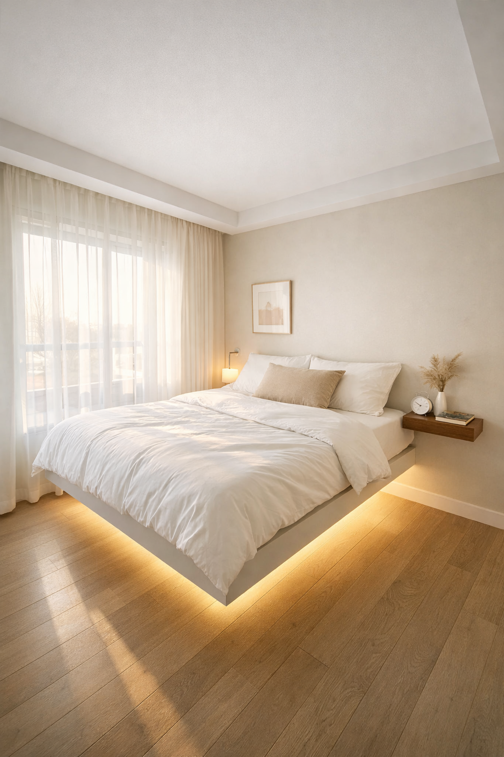 A floating or wall-mounted platform bed can create a visual breathing space. If the floor beneath is visible — particularly with the subtle LED lighting your bedroom instantly appears larger and more spacious.