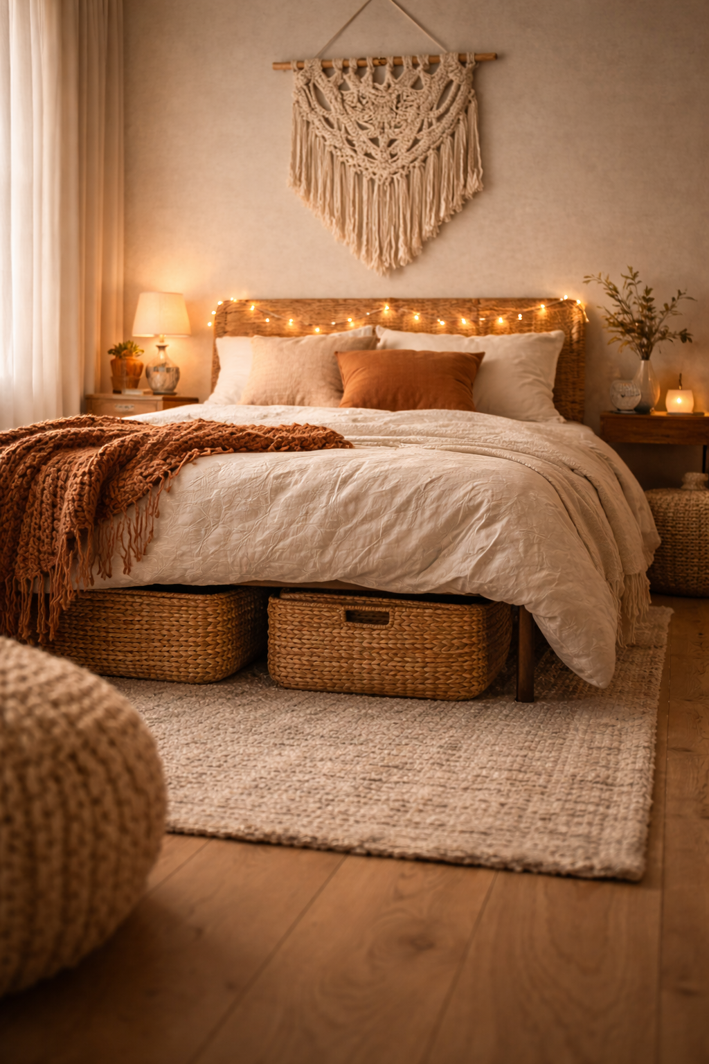 In smaller bedrooms the texture adds warmth, without creating clutter. Use woven baskets, rugs macrame, or even blankets made of linen, to help make the space feel warm and inviting.