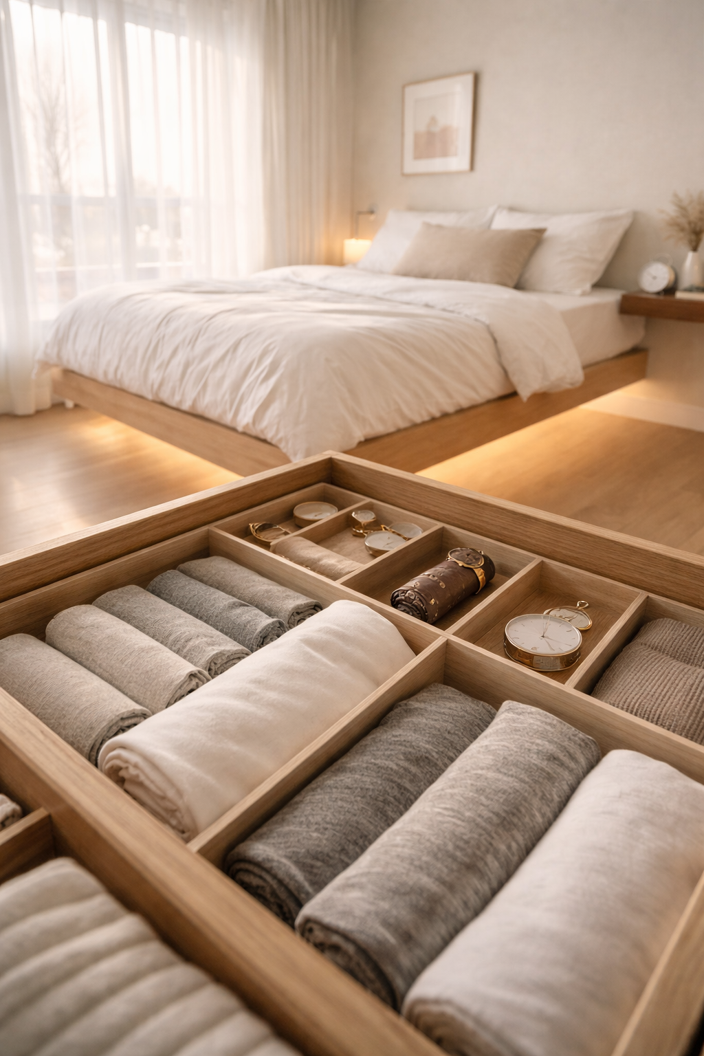 Built-in shelves under the bed can eliminate the requirement for additional furniture. These shelves are ideal for storing decor, books or personal belongings and keeping the space well-organized.