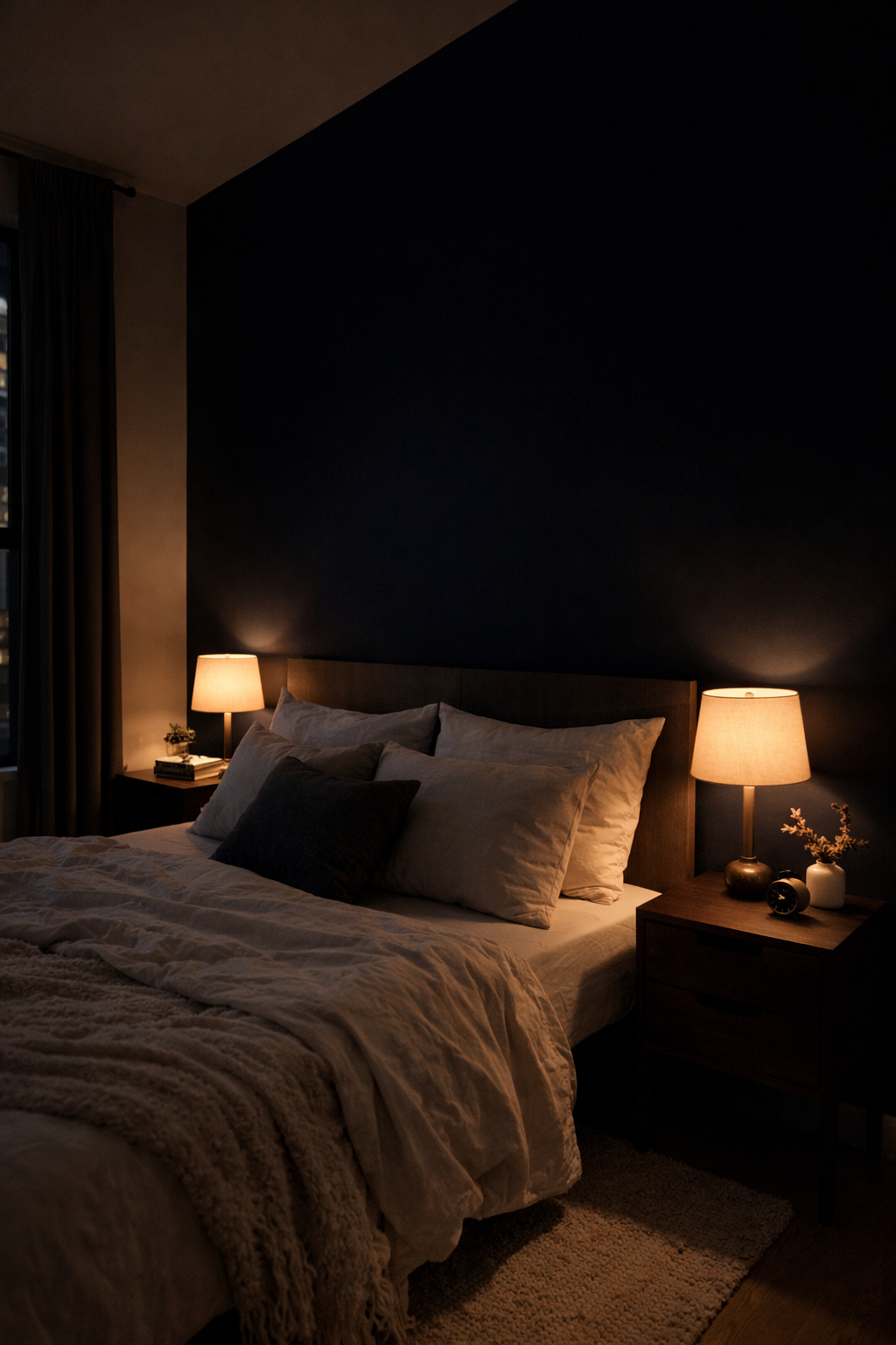 A tiny bedroom can be luxurious when decorated for evening ambience. The rich navy or charcoal-coloured accent walls with soft lighting for the bed create a warm and intimate space.