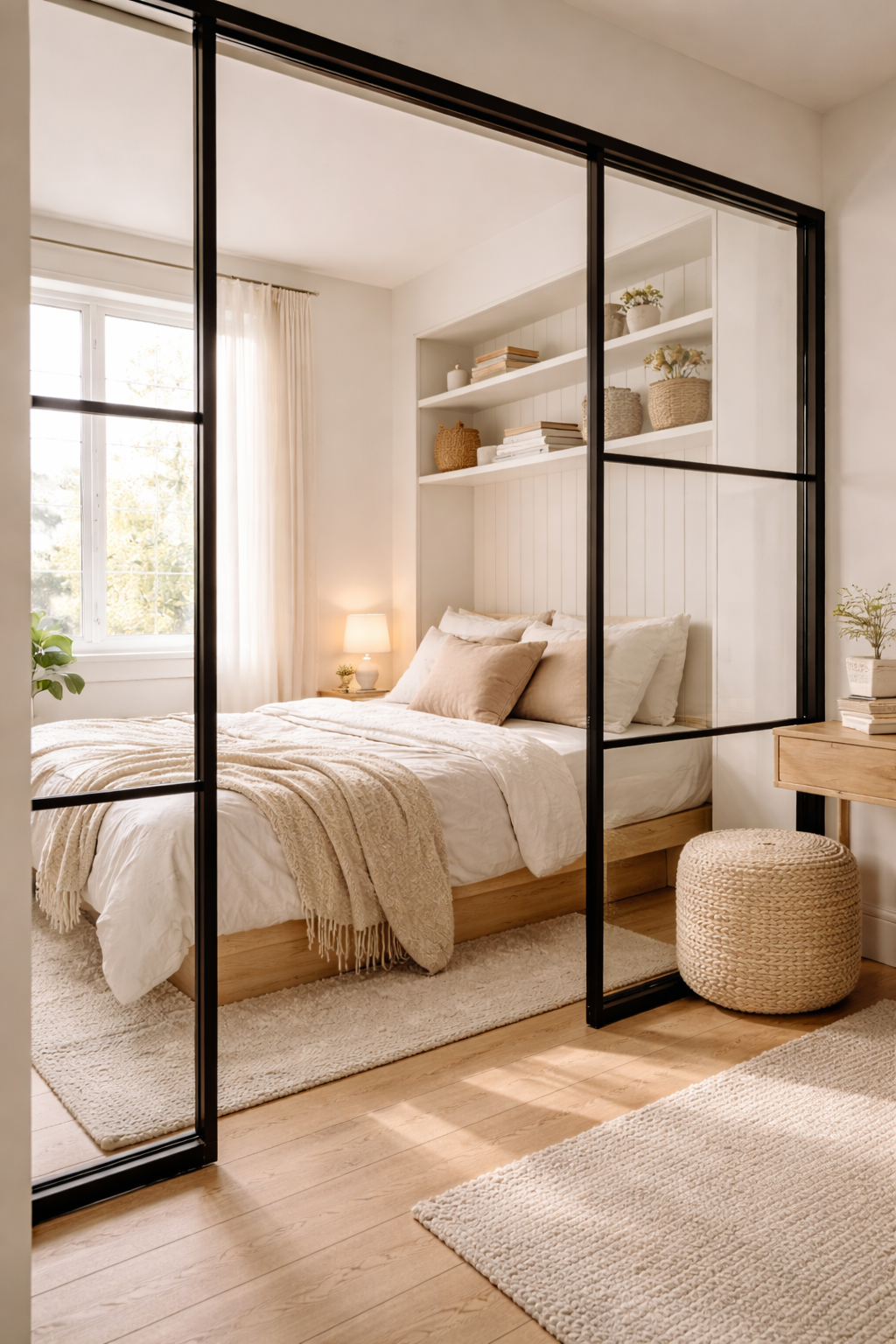 In studios A black-framed glass partition could be used to define the sleeping space while not blocking sunlight. This helps keep the space fresh and airy, while also creating visual distinction.