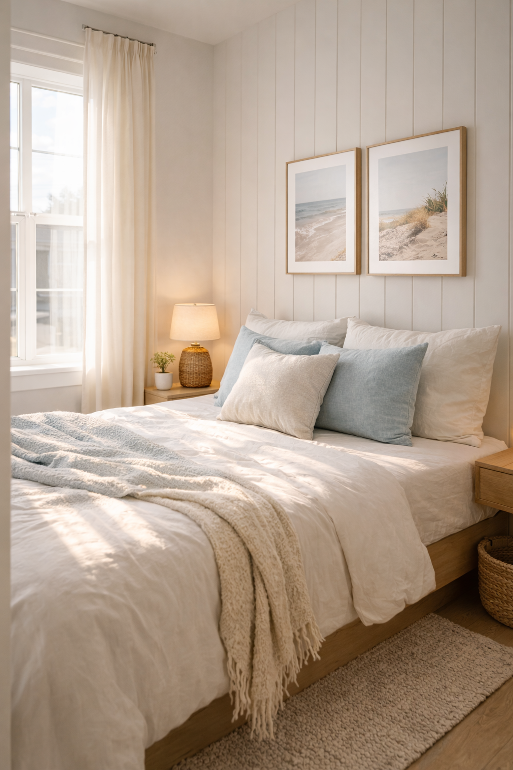 White walls and soft blue accents and natural weaved textures create a room that feels airy and spacious. The coastal-inspired style is perfect for smaller bedrooms due to its airy palette of colors.
