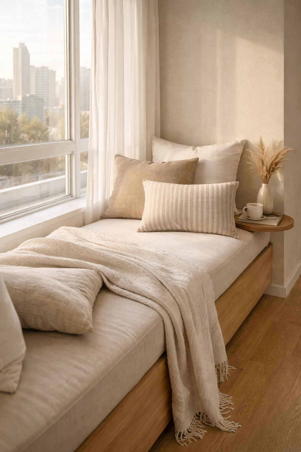 Instead of putting a heavy chair in a tiny space change the area around the windows into a built-in daybed, or reading space. Layer cushions and soft linen textures and a warm, natural light source for an inviting and space-saving style.