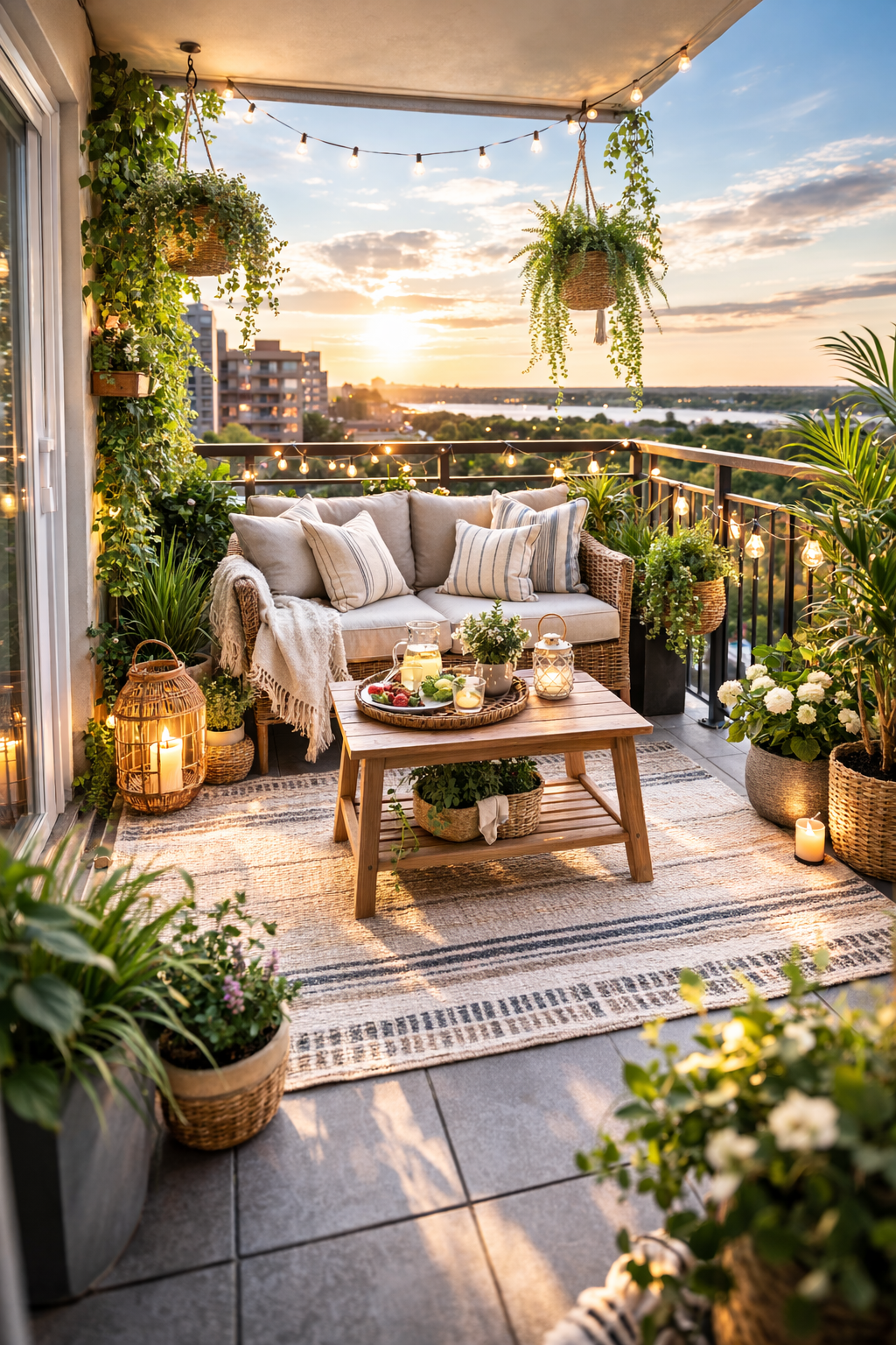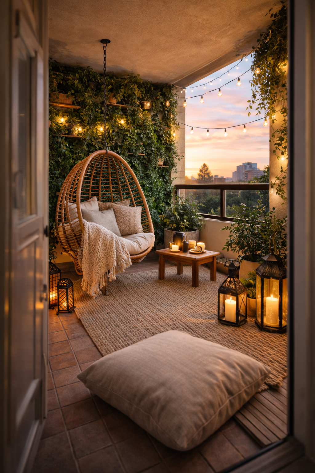 An egg-shaped hammock or a hanging chair immediately transforms an apartment patio. It gives a unique look without sacrificing space. It can be paired with lanterns, fairy lights, or an elongated greenery wall to create the perfect boho chic look.