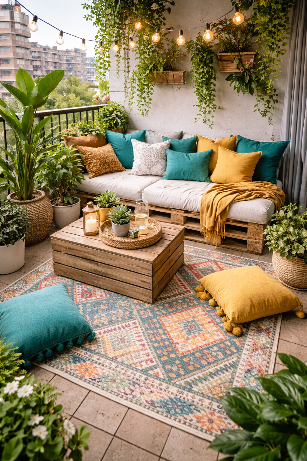 Pallet seating made from wood is affordable and is ideal for small space. Include vibrant cushions in mustard, teal, or coral. Spread a rug with patterns and mix potted plants to create a fun look.