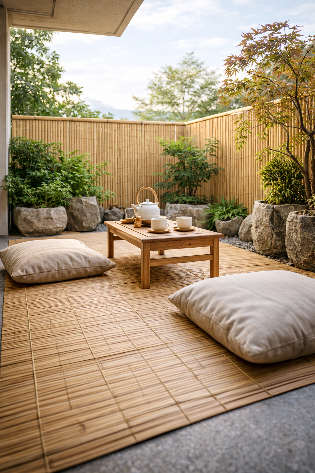 To create a modern and calm style, opt for a minimalist design by incorporating floor cushions and a table made of wood. Mats made of bamboo, neutral shades and stone accents make the perfect Japanese-inspired, peaceful outdoor space.