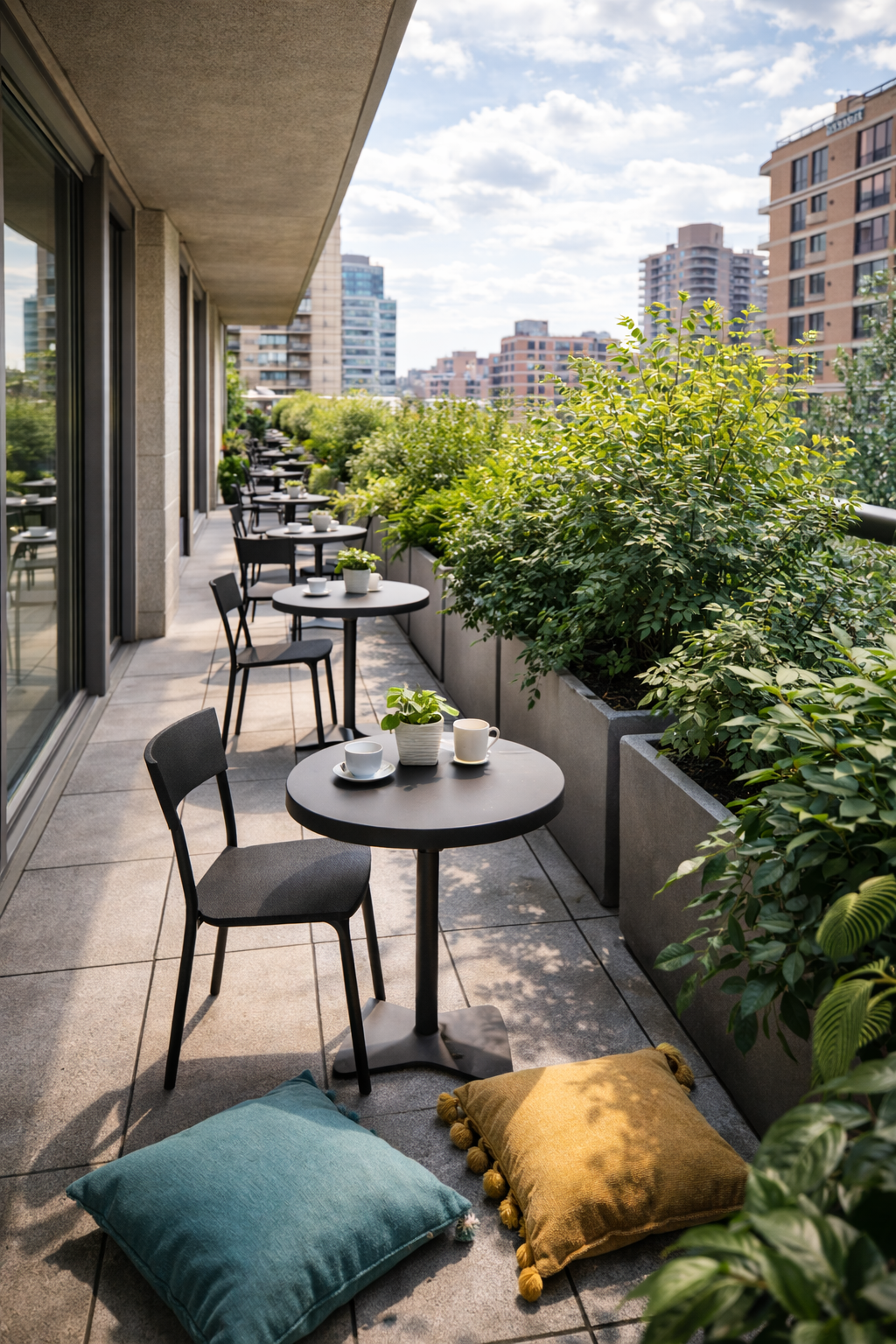 If your property has a bigger patio, place a couple of small tables for cafes along the railing. Make use of slim black chairs and the built-in planter boxes that are designed to be used for the greenery.
