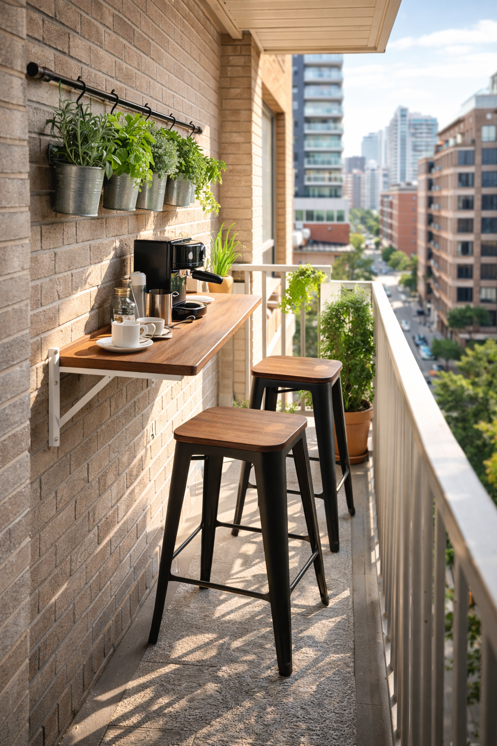 A small balcony doesn’t have to hinder your creativity. Install a wall-mounted, foldable counter, and then pair it with two bar stools with slim legs. Hang hanging planters over to give a stylish, fresh accent.