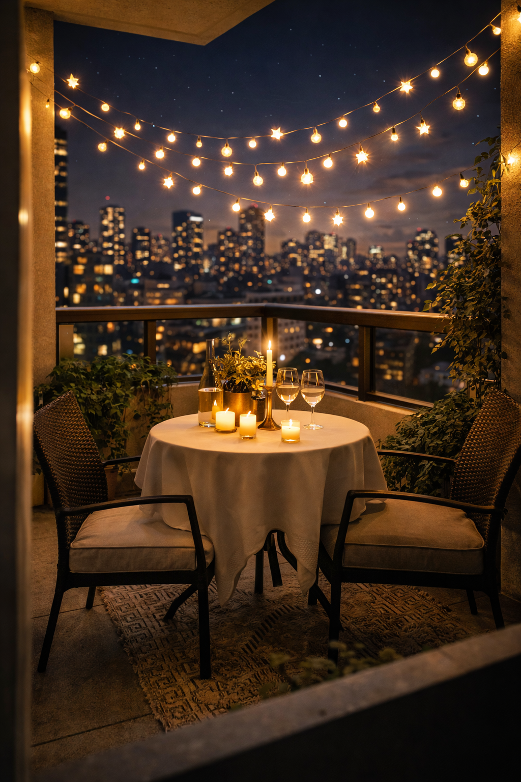 Turn your balcony into a private dining area. A small table set with a white tablecloth as well as candles and soft string lights will create a magical atmosphere for your evening.