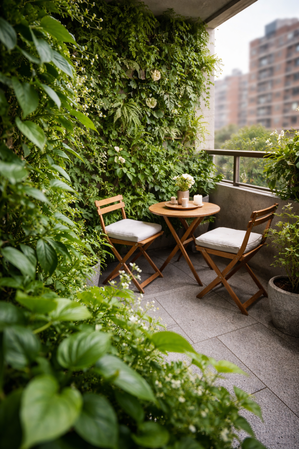 If floor space is limited When space is limited, try to a vertical. Install a living wall or stacked planters on the side of your balcony. It can be paired with compact folding chairs as well as a small round table.