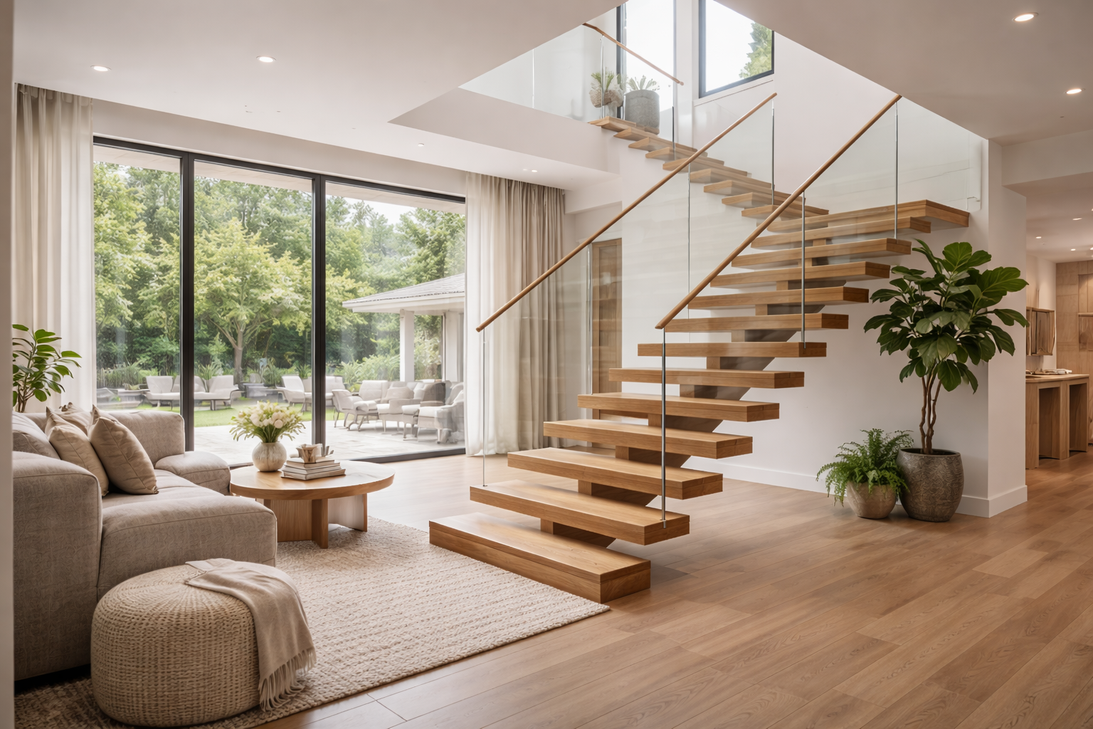A staircase that is open in the living space provides architectural interest and visual flow. Glass balustrades, floating treads, and big window frames can provide a spacious and airy feel. This kind of staircase is ideal for contemporary open-plan designs.