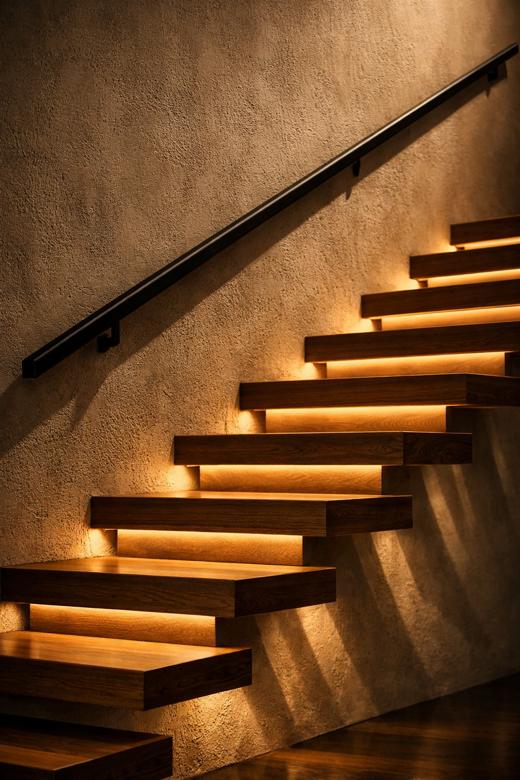 Floating staircases provide a sleek contemporary look that feels open and light. By incorporating LED strip lighting underneath each tread adds to the floating effect while increasing the safety. Warm lighting enhances the look and cool lighting gives an airy feel. This style is perfect for modern and minimalist houses.