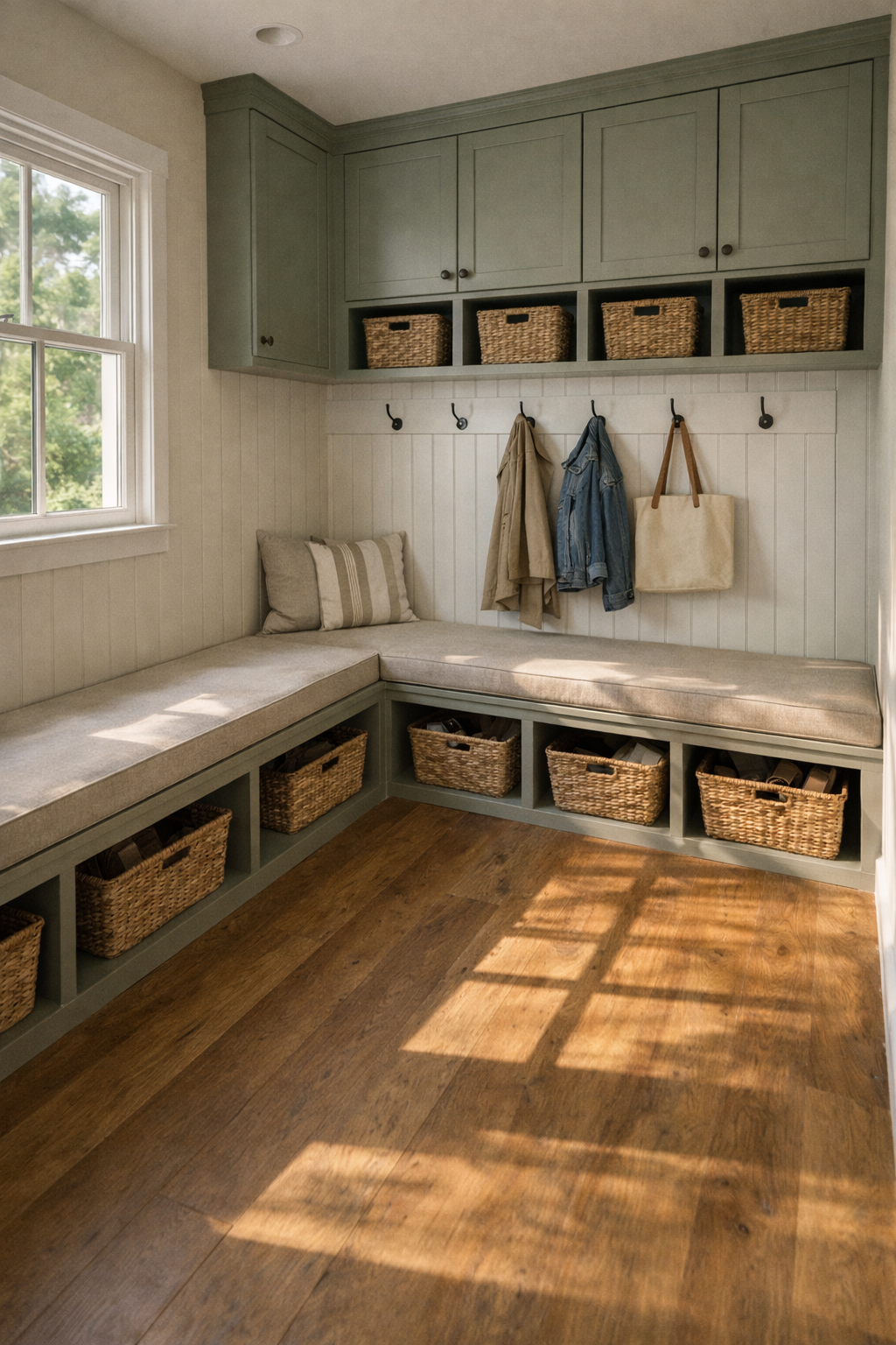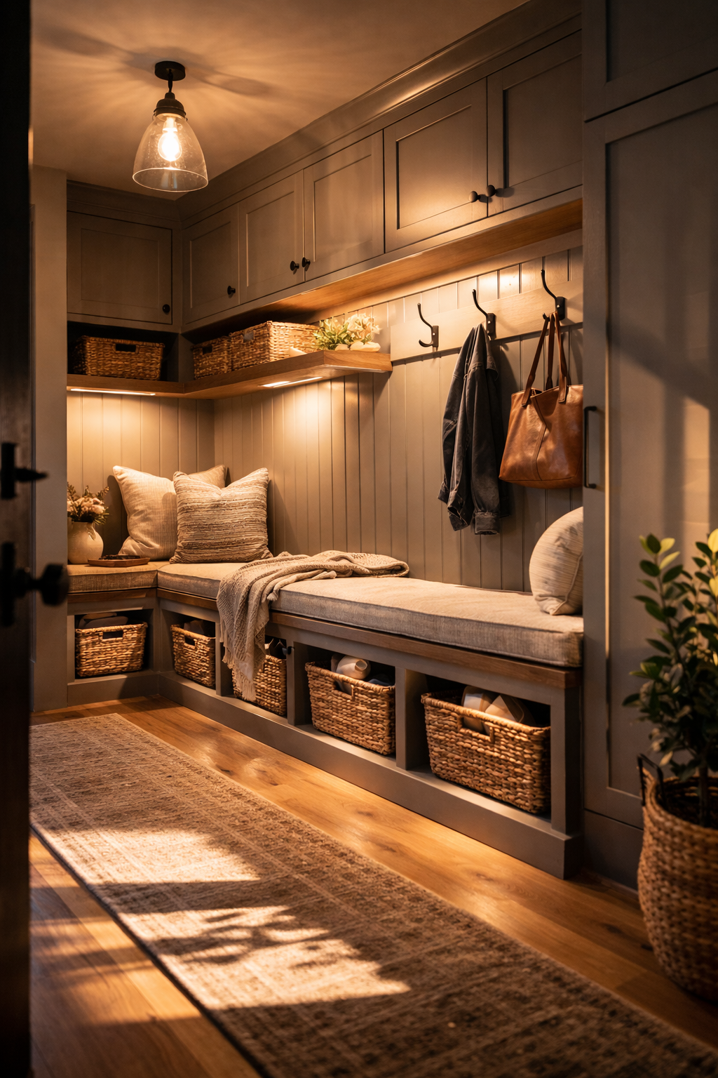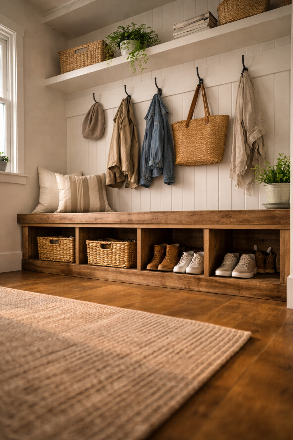 This style is particularly effective in cottage, farmhouse, or coastal houses. Baskets are labeled to identify every family member to make mornings more organized and less stress-inducing.
