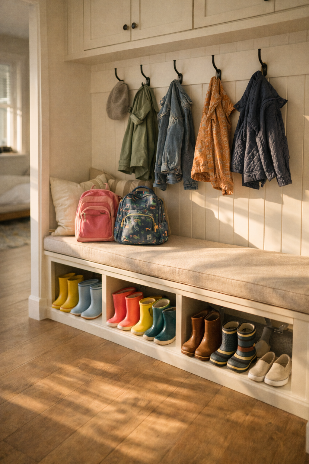 Families with busy schedules benefit from having storage areas clearly marked. Labeled shelves, hooks lower to children and shoe storage cubbies.