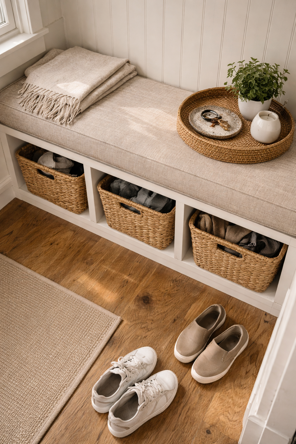 If you’re looking for a lighter and more casual style go for cubbies that are open under your bench. Baskets made of woven fabric add the look of a warm and textured interior while concealing the everyday clutter.