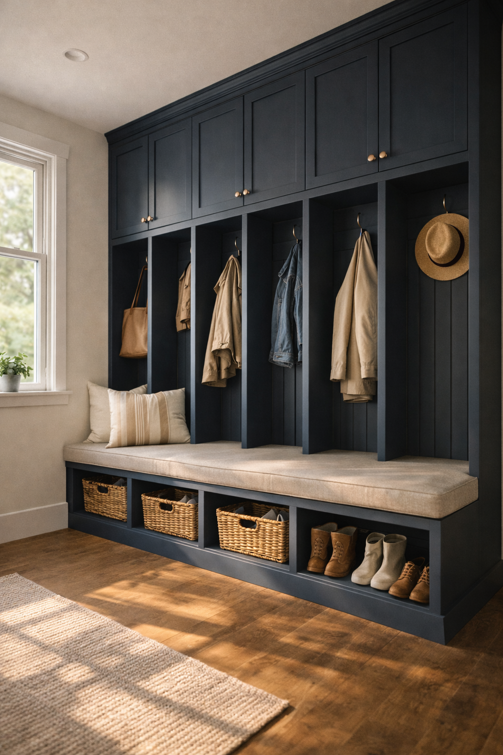 The tall built-in lockers offer an area for every family member. This arrangement keeps clutter from spreading across the house.