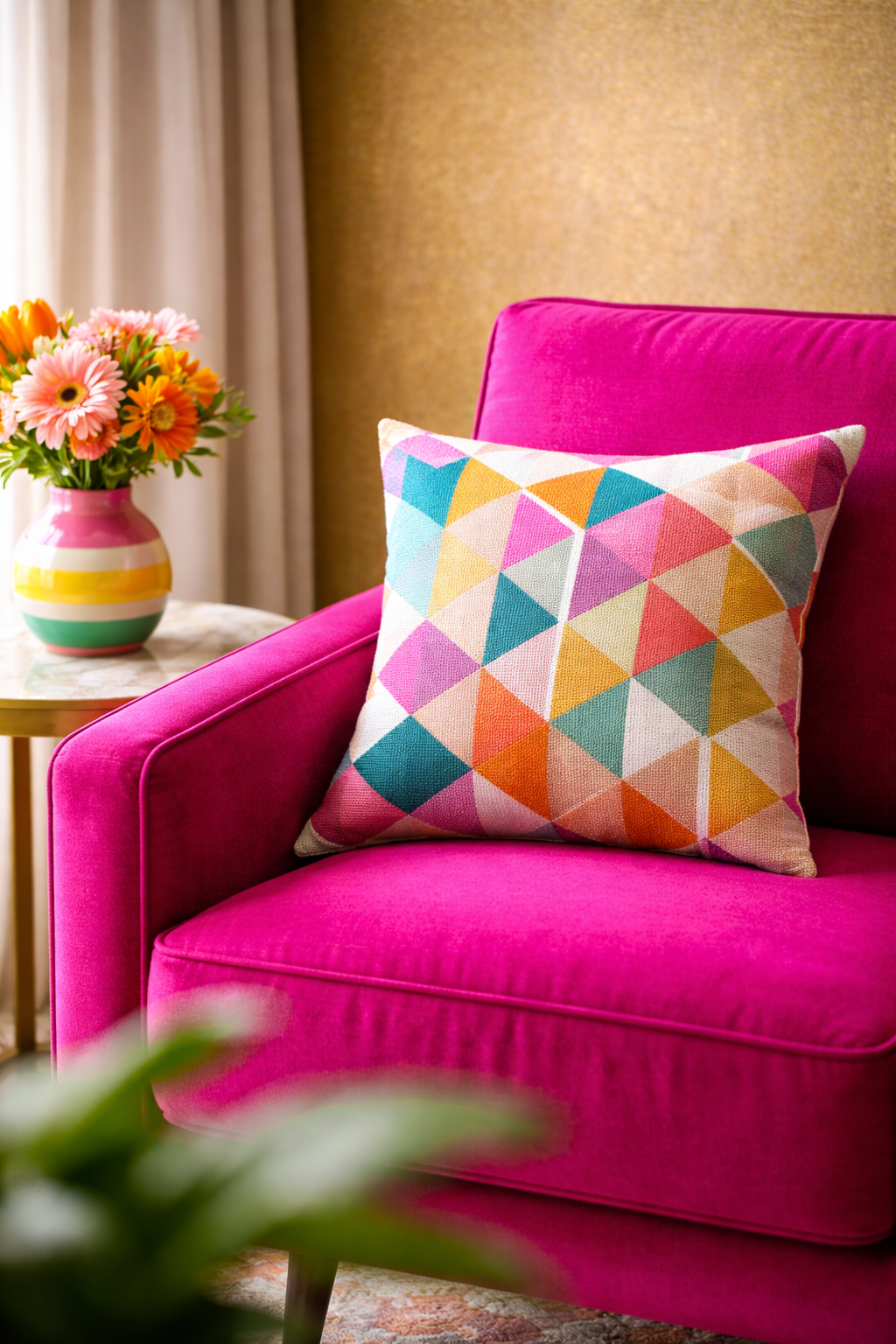 Sometimes, just one accent piece can be enough. A vibrant fuchsia-colored lounge chair furnished with pillows that are patterned and a dazzling ceramic vase can change the look of the look of a dull corner.