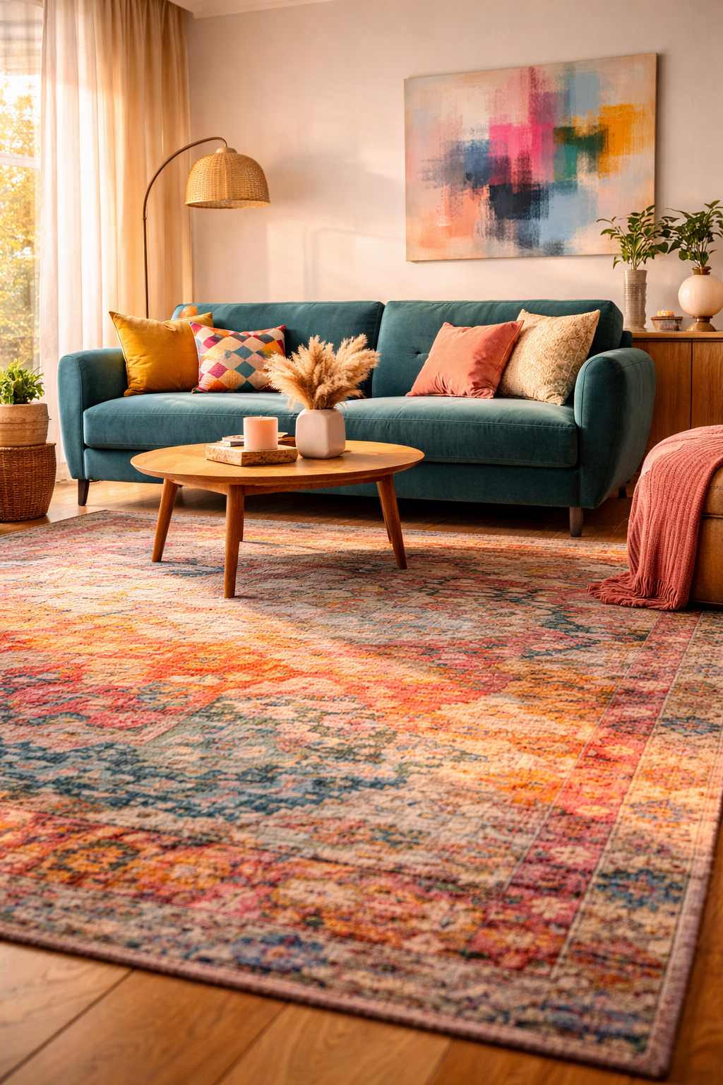 The rug can be paired with a teal curved couch and abstract art to create an eclectic and modern style. This design is great for contemporary spaces where layering patterns and colors can add dimension without taking over the room.
