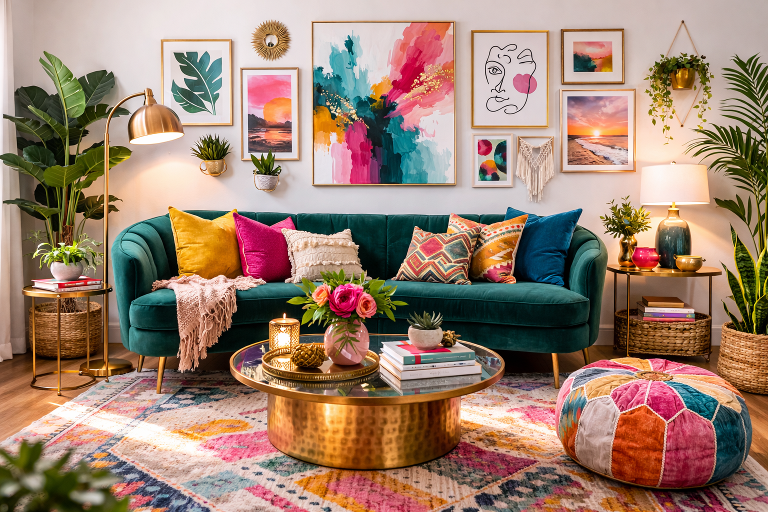 A dazzling emerald-colored sofa with a gallery wall that is vibrant creates an artistic, curated environment. Mix different frame designs, sizes of art, and bold prints to add a sense of style.