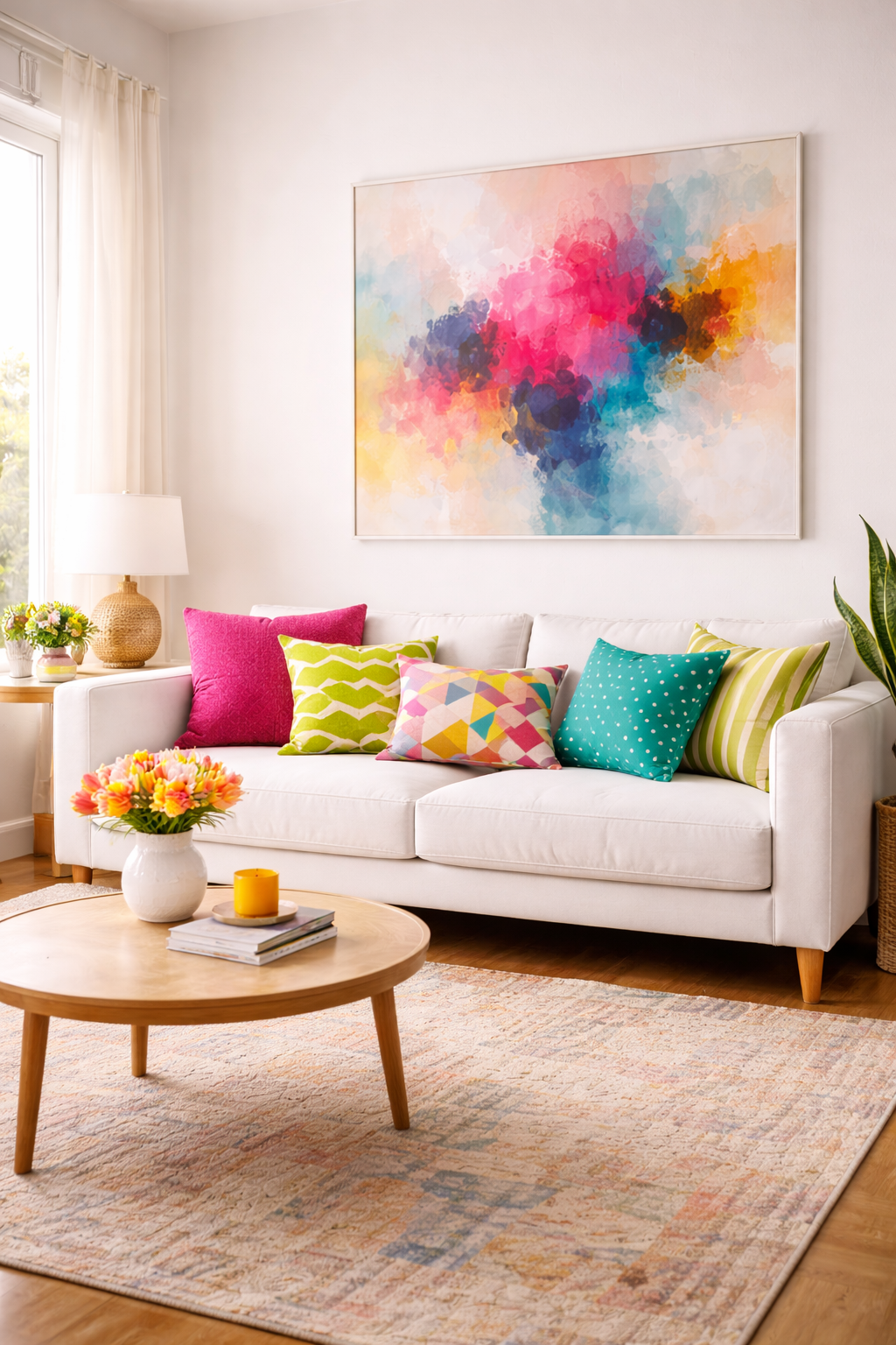 If you like clean and simple interiors but you love vibrant decor Start with a minimal white base. A neutral sofa can be the perfect canvas for magenta lime, and teal cushions.
