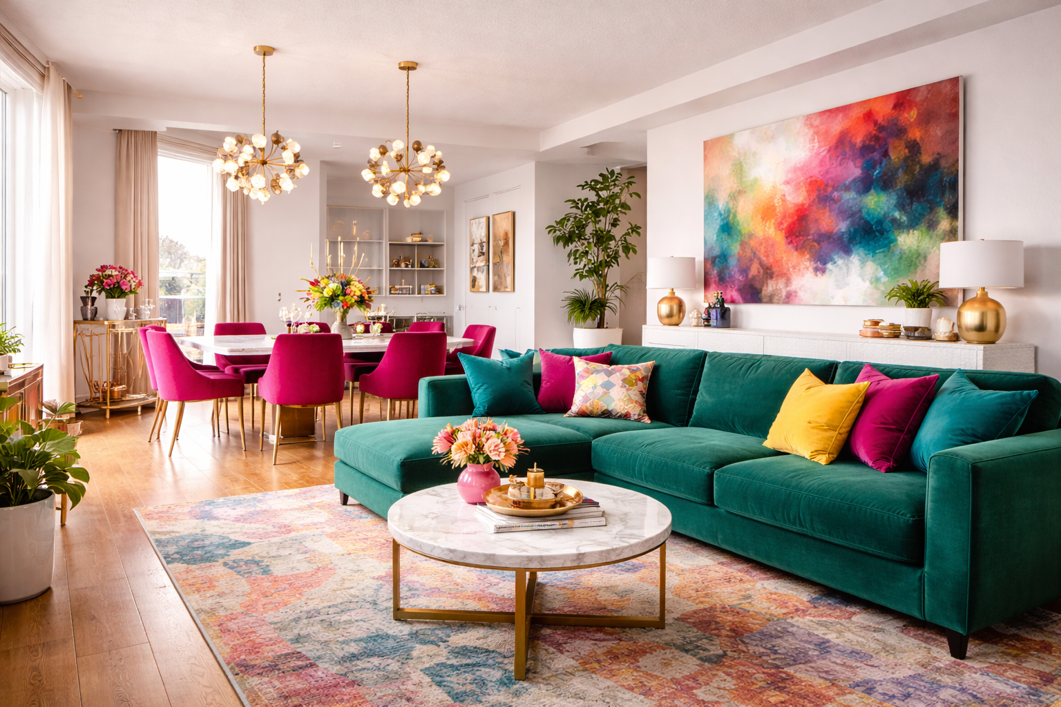 In open-plan homes, color can unify different zones. Imagine a sectional with emerald in the living room with a hot pink dining chair close by. Gold globe lighting brings the warmth and elegance.