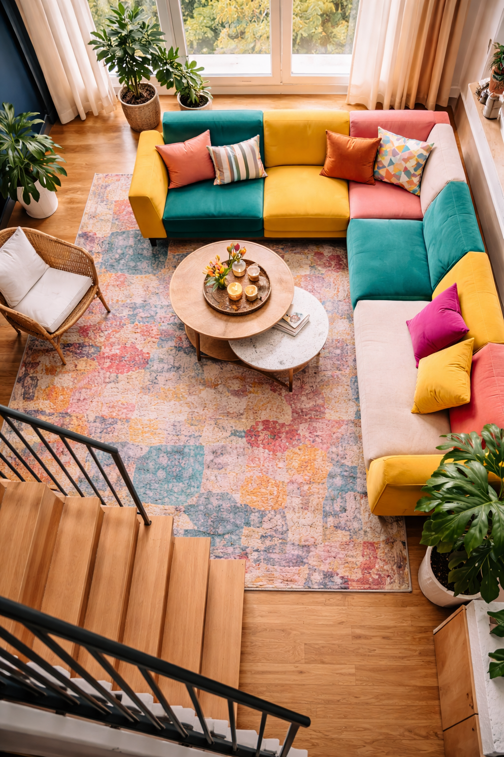 A view from the top emphasizes the furniture’s layout and the distribution of colors. Multiple-colored modular seating as well as abstract rugs and coffee tables that are layered provide a visually stimulating space.
